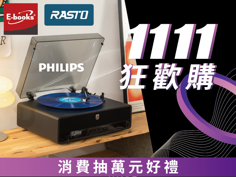 E-books × RASTO 限時回饋,音樂豪禮抽回家!活動期間內,購買 E-books/RASTO 任一品項滿 NT$1,111,即可參加抽獎,有機會把 PHILIPS 百年紀念 All-in-one 黑膠音箱帶回家!立即登錄抽獎