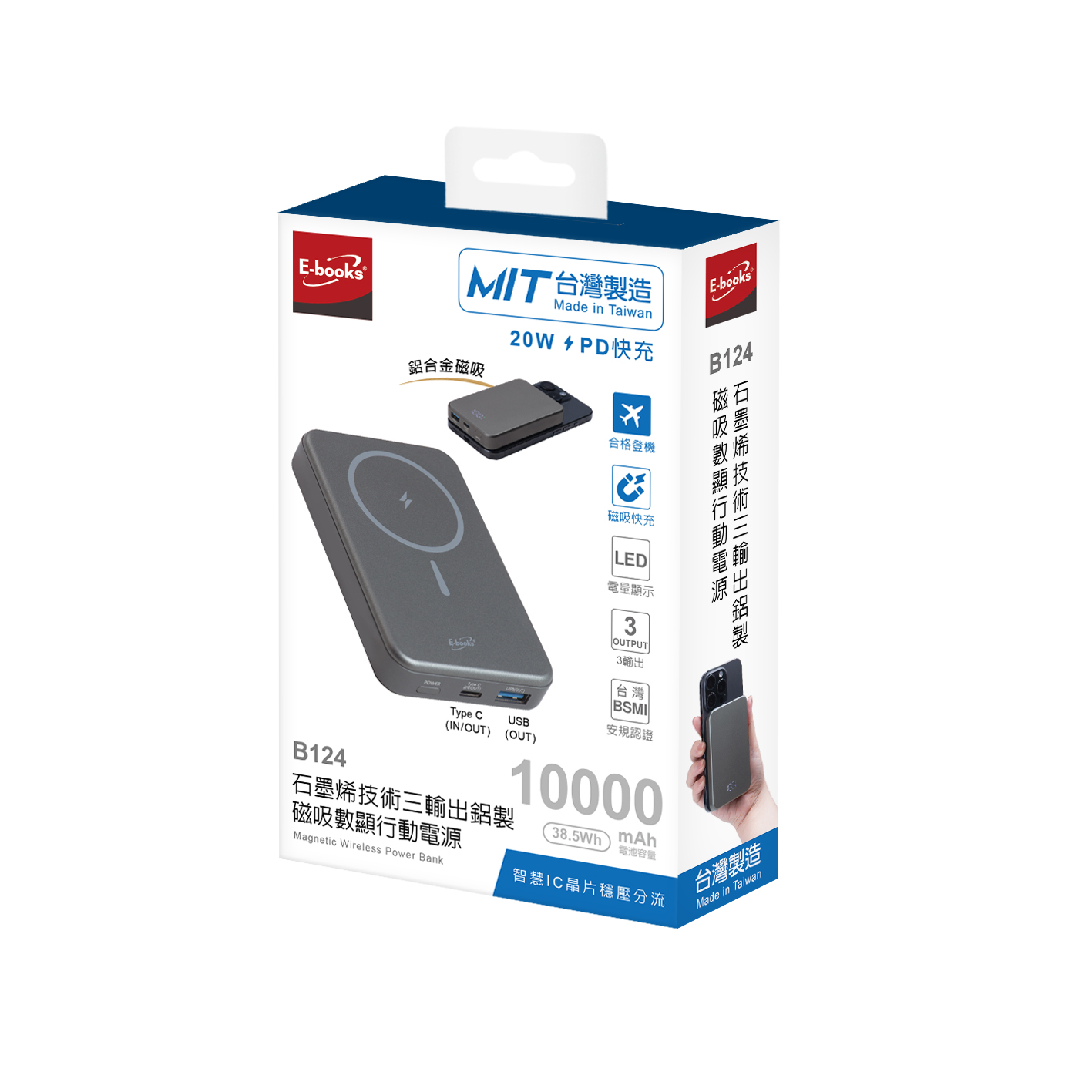E-books B124 石墨烯技術三輸出鋁製磁吸數顯行動電源