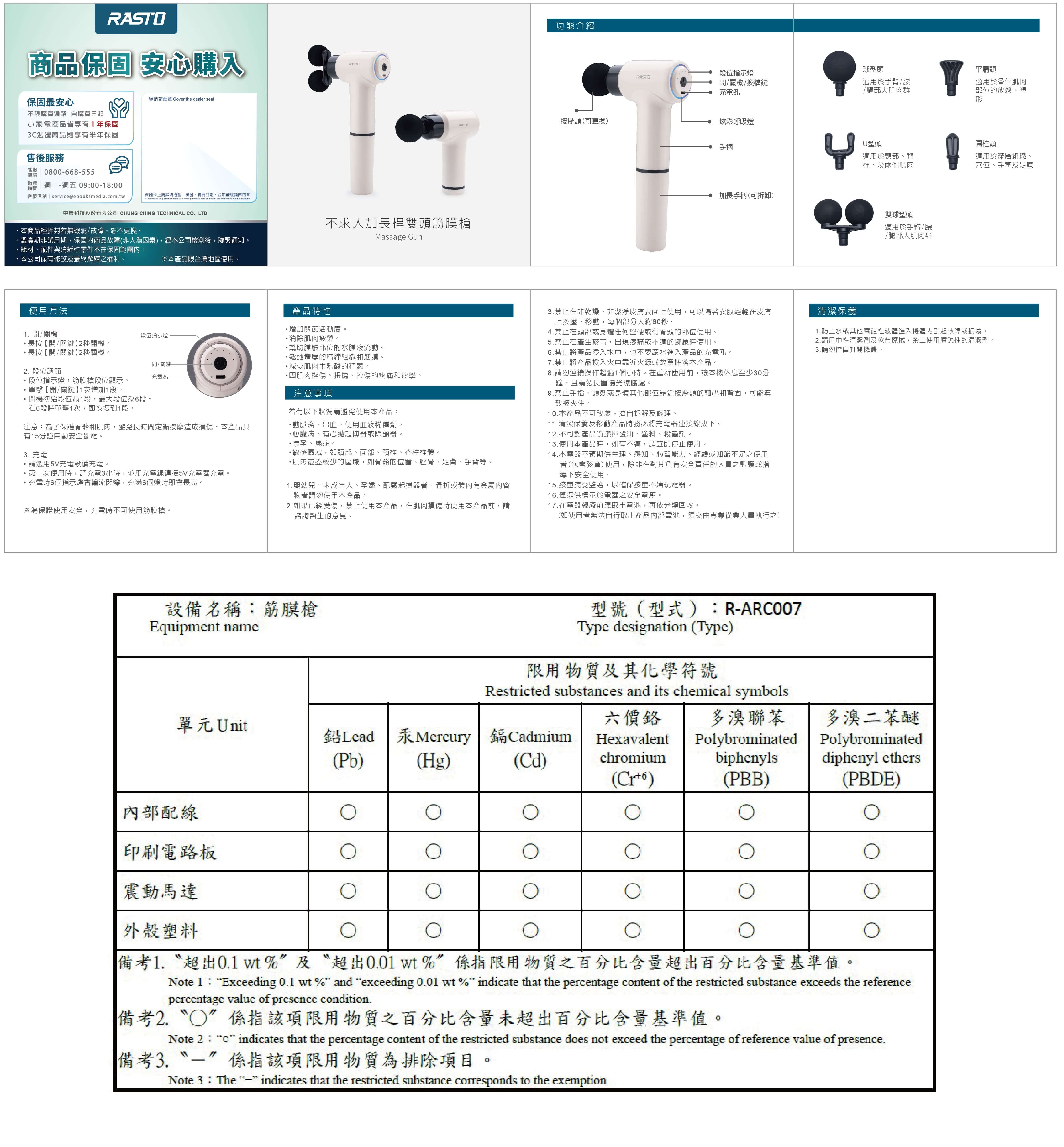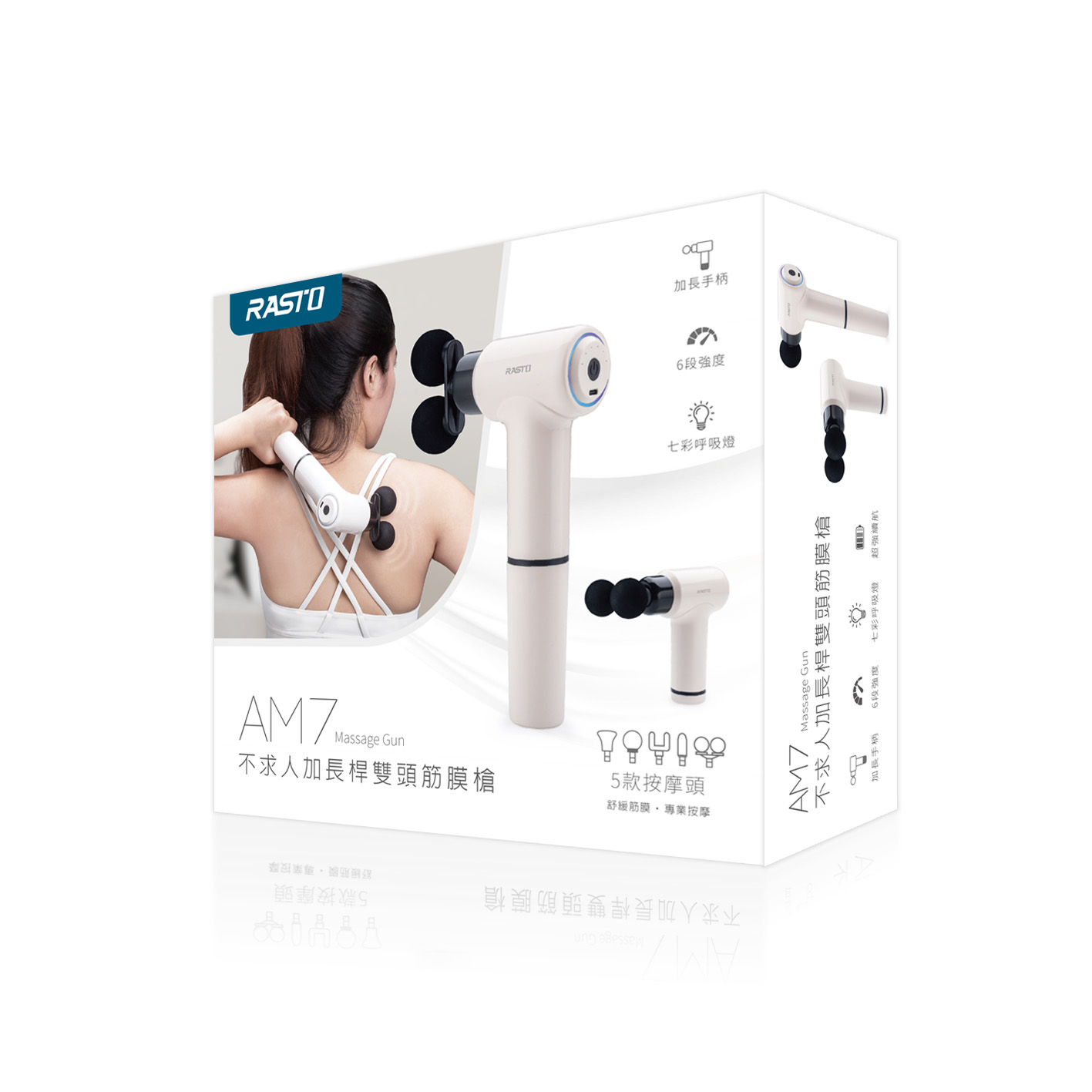 - 內容物:筋膜槍、加長手柄、5款按摩頭、充電線