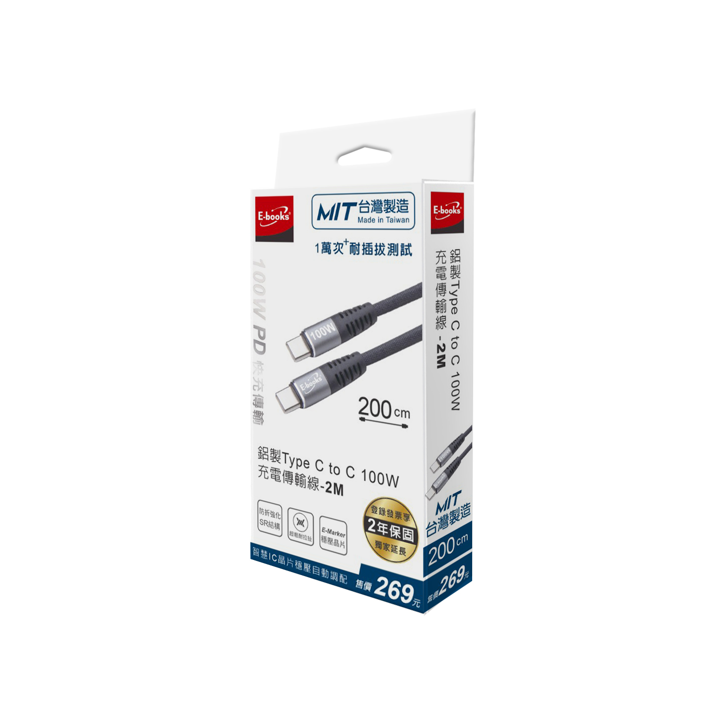 E-books XA70 【台灣製造】鋁製Type C to C 100W充電傳輸線-2M