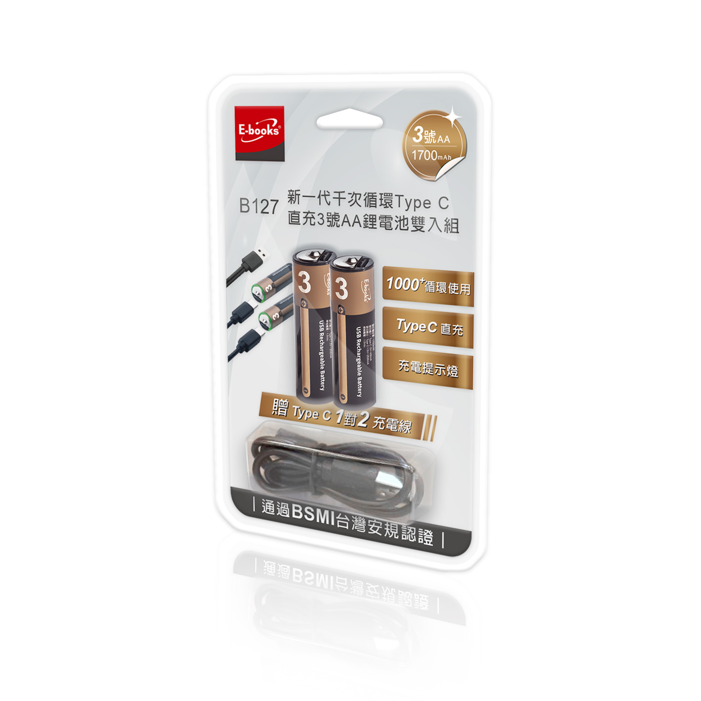 E-books B127 新一代千次循環Type C直充3號AA鋰電池雙入組 贈 一對二充電線