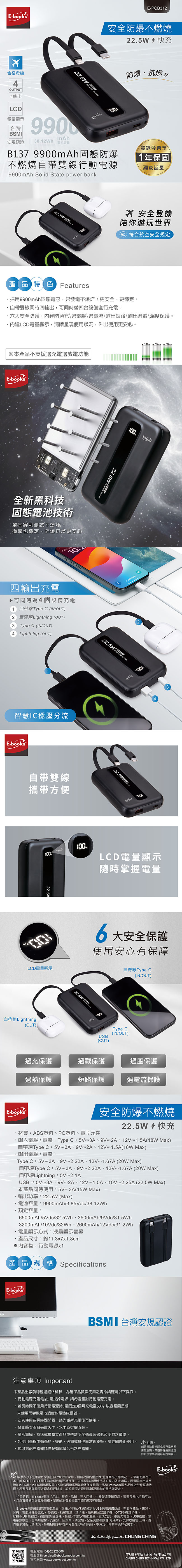 E-books B137 9900mAh固態防爆不燃燒自帶雙線行動電源
