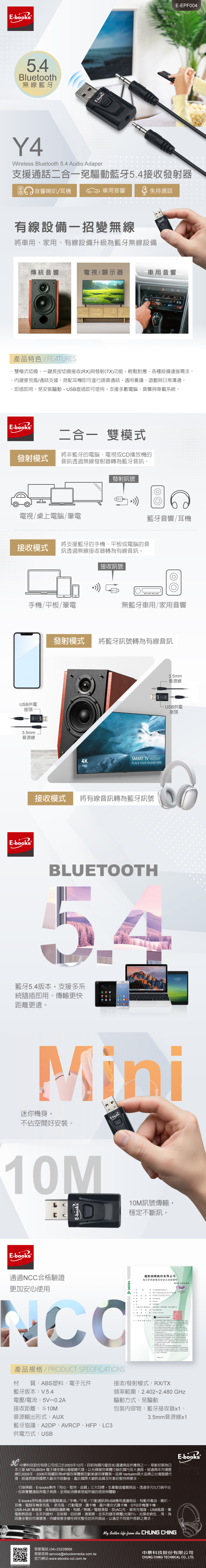 E-books Y4 支援通話二合一免驅動藍牙5.4接收發射器