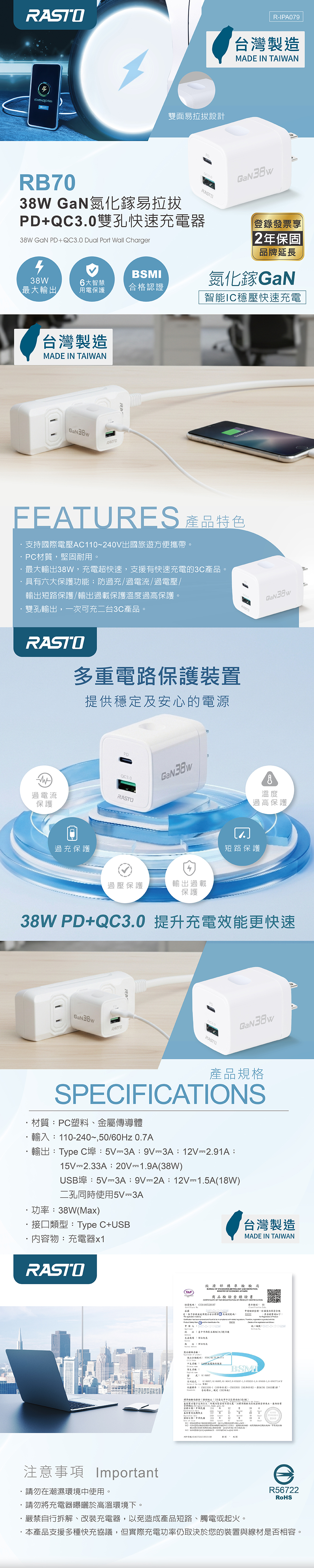 RASTO RB70【台灣製造】 38W GaN氮化鎵易拉拔PD+QC 3.0雙孔快速充電器