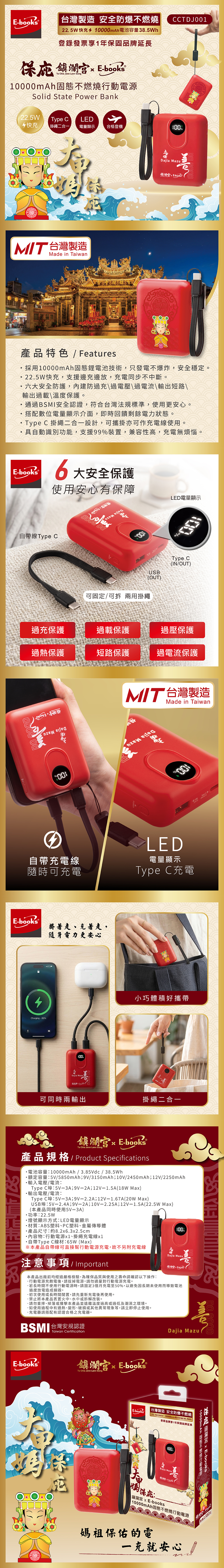 【台灣製造】 保庇鎮瀾宮 x E-books 10000mAh固態不燃燒行動電源