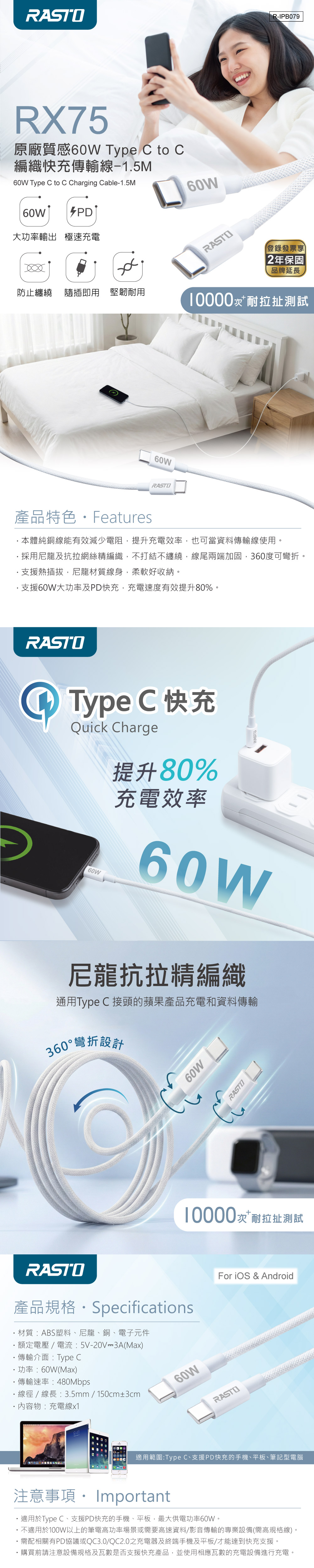 RASTO RX75 原廠質感60W Type C to C 編織快充傳輸線-1.5M