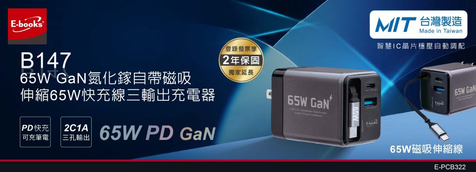 【2026.03】E-books B147 【台灣製造】65W GaN氮化鎵自帶磁吸伸縮65W快充線三輸出充電器
