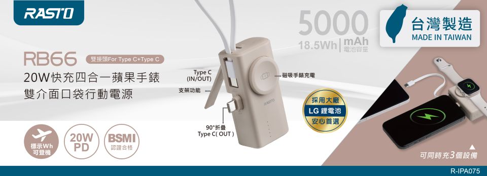 RASTO RB66 【台灣製造】20W快充四合一蘋果手錶雙介面口袋行動電源