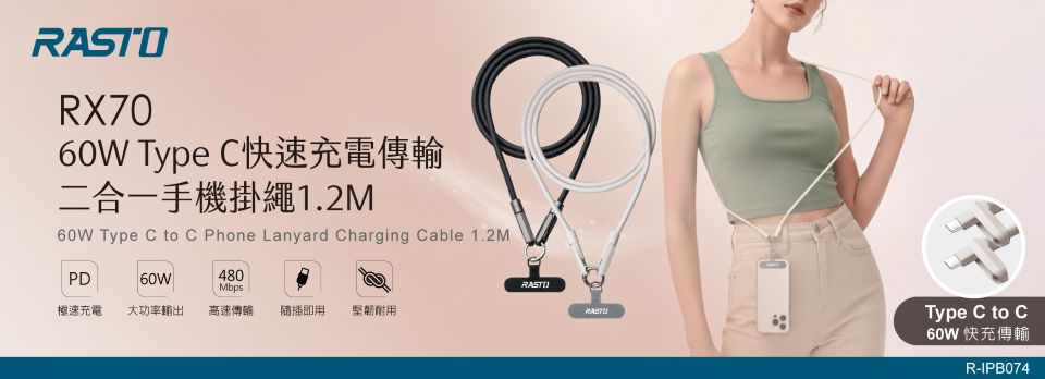 【2026.03】RASTO RX70 60W Type C快速充電傳輸二合一手機掛繩1.2M