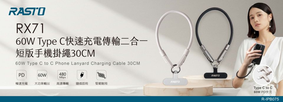 【2026.03】RASTO RX71 60W Type C快速充電傳輸二合一短版手機掛繩30CM