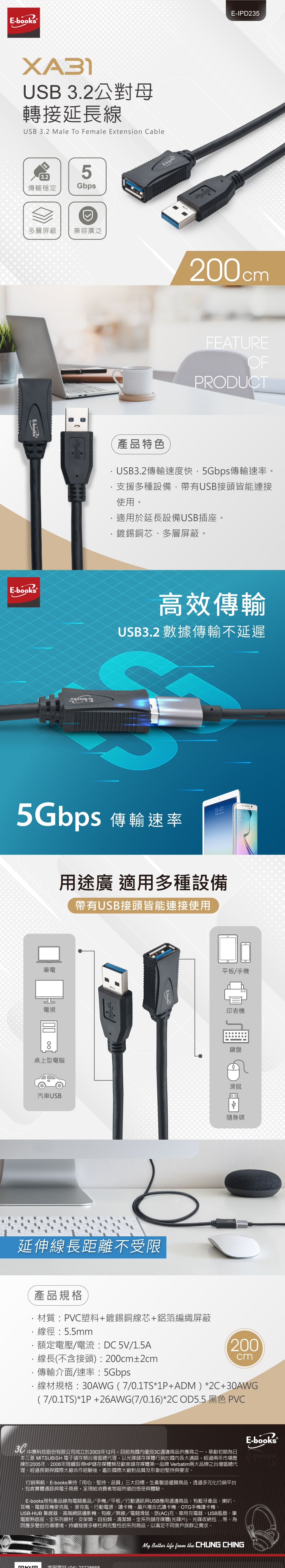 E-books XA31 USB 3.2 公對母轉接延長線-2M