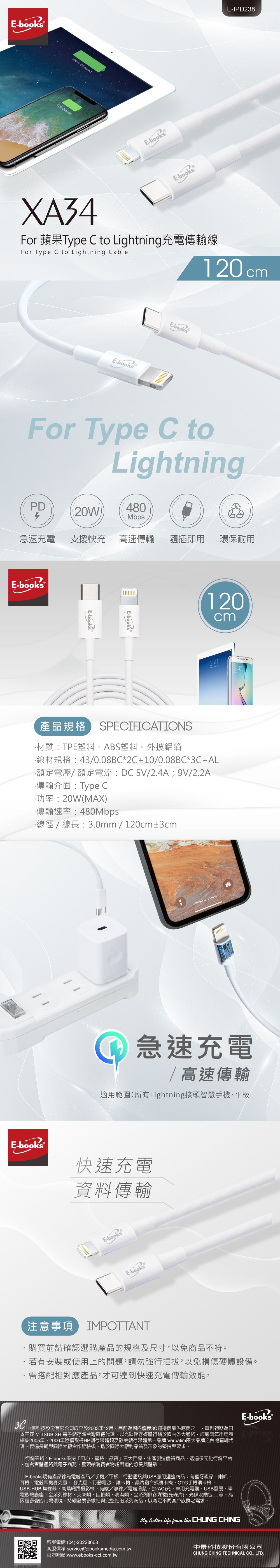 E-books XA34 For蘋果Type C to Lightning充電傳輸線1.2M