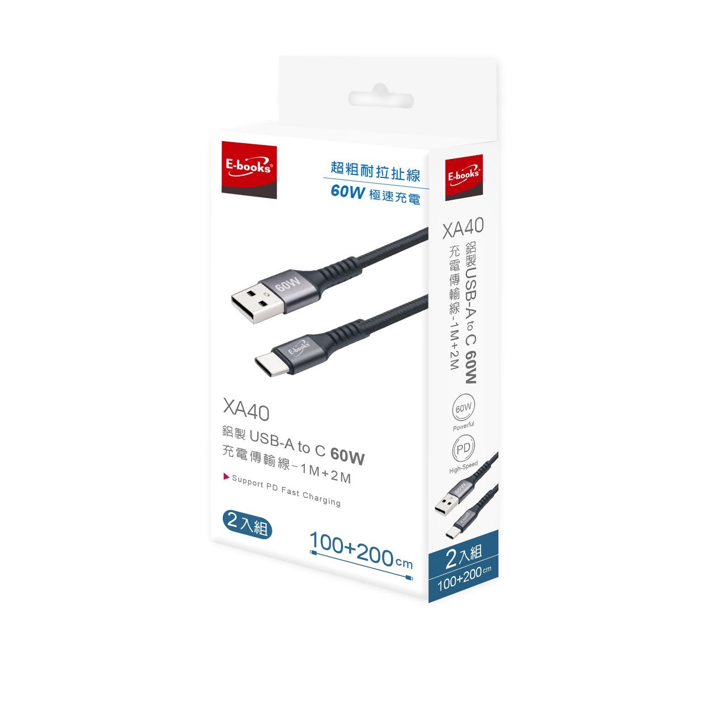 E-books XA40 鋁製USB-A to C 60W充電傳輸線-1M+2M