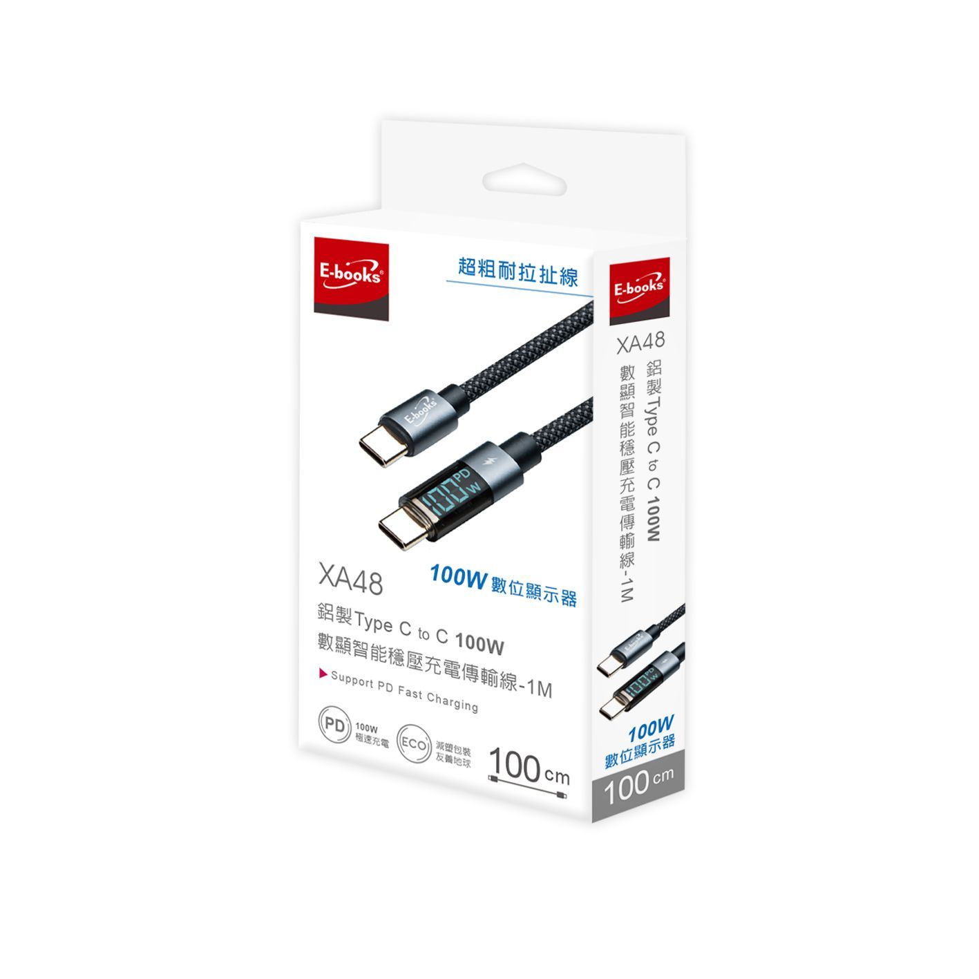 E-books XA48 鋁製 Type C to C 100W數顯智能穩壓充電傳輸線-1M