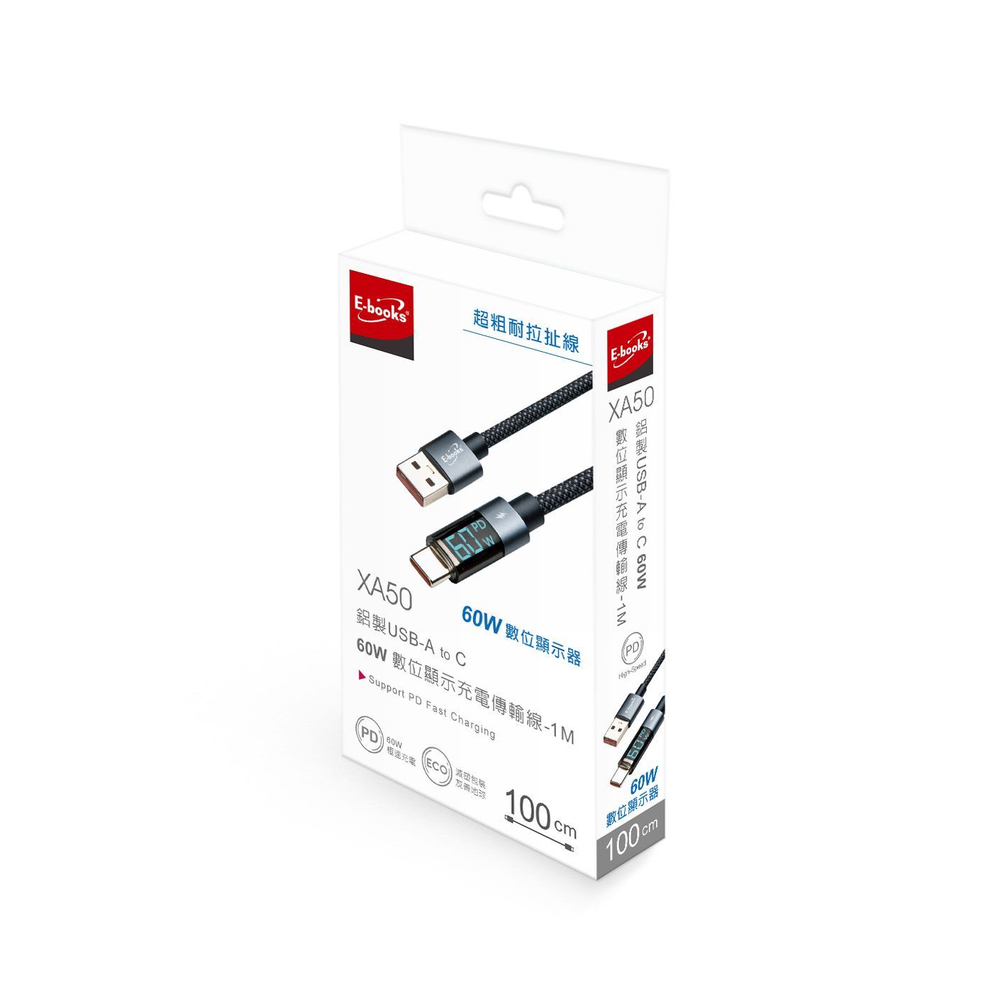 E-books XA50 鋁製 USB-A to C 60W數位顯示充電傳輸線-1M