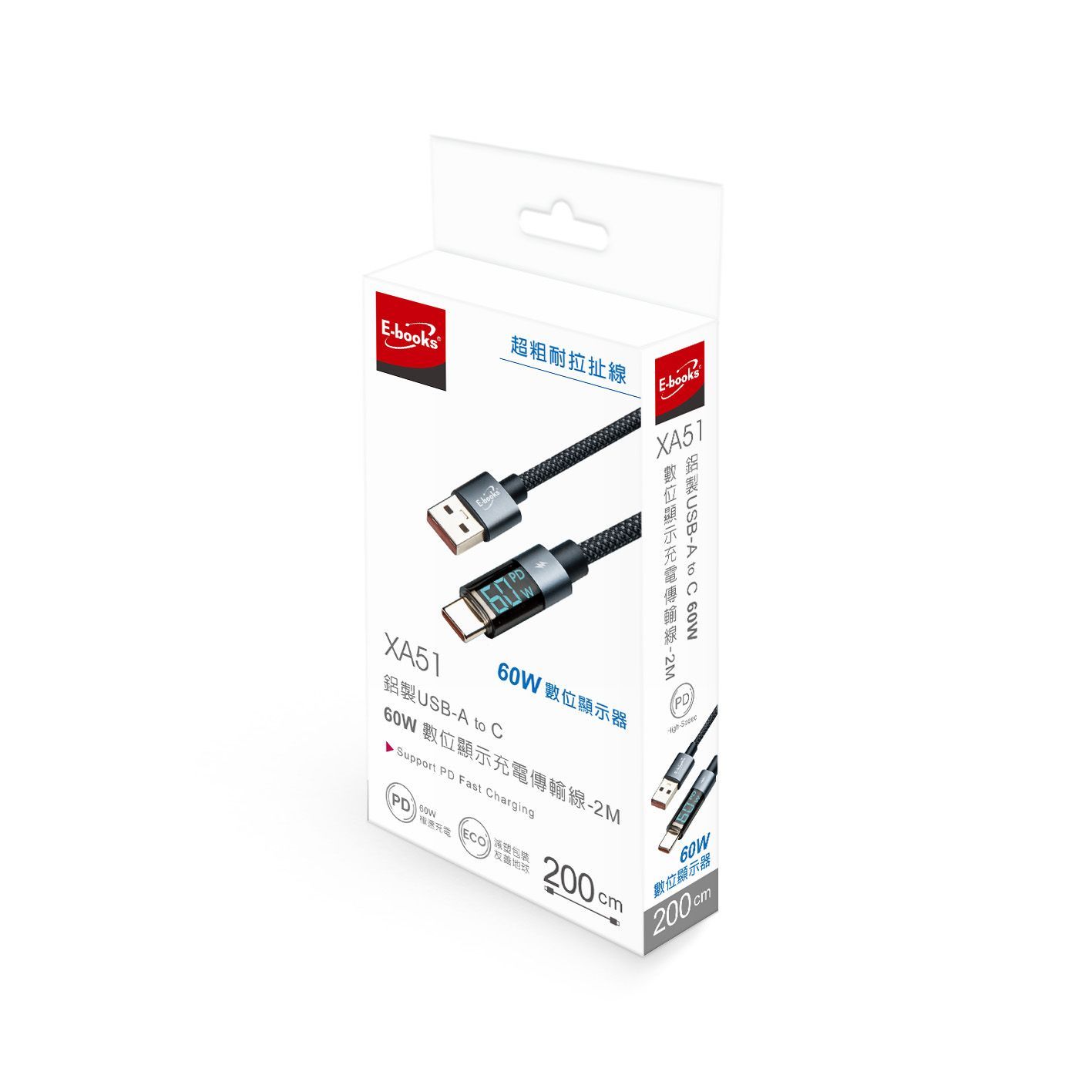 E-books XA51 鋁製 USB-A to C 60W數位顯示充電傳輸線-2M