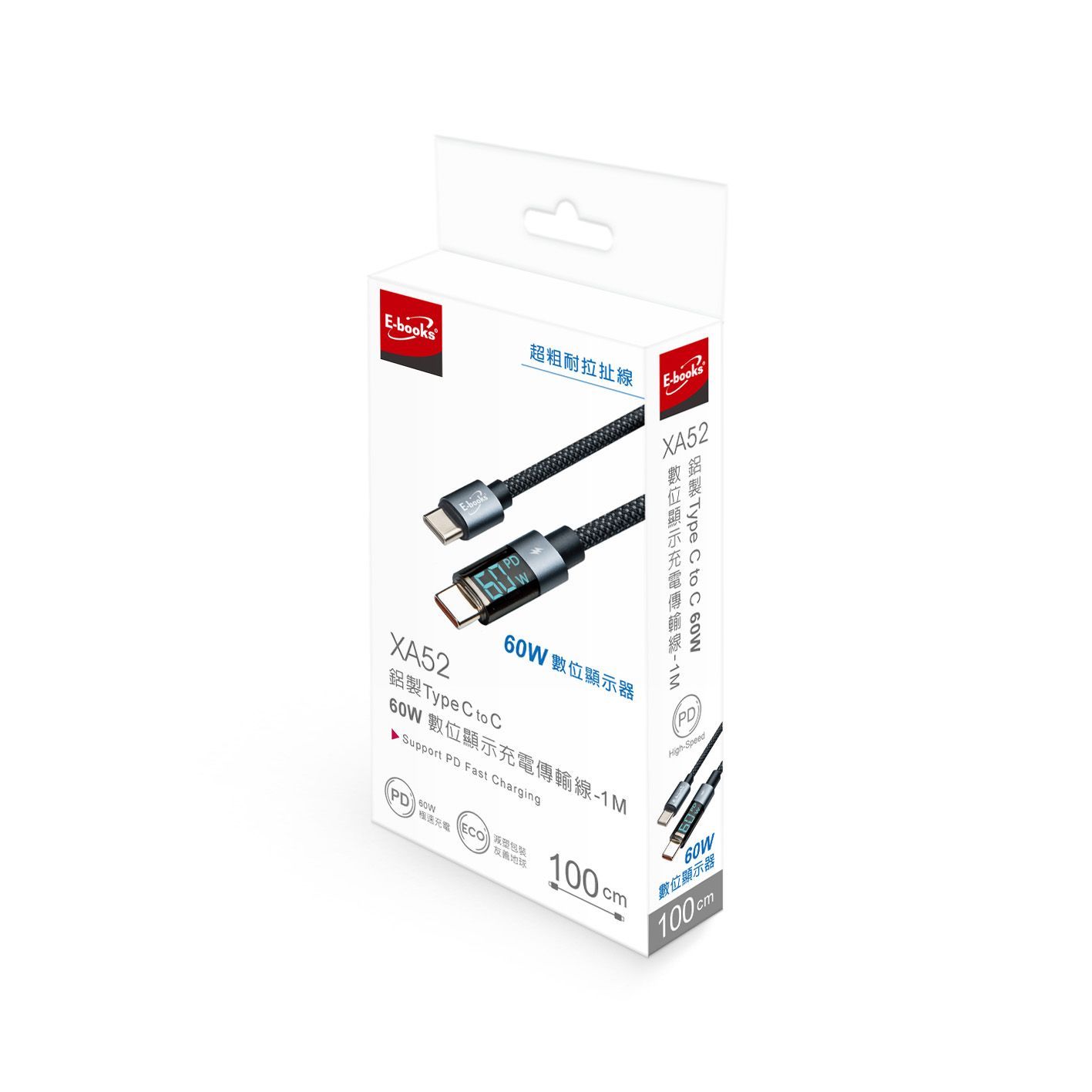 E-books XA52 鋁製 Type C to C 60W數位顯示充電傳輸線-1M