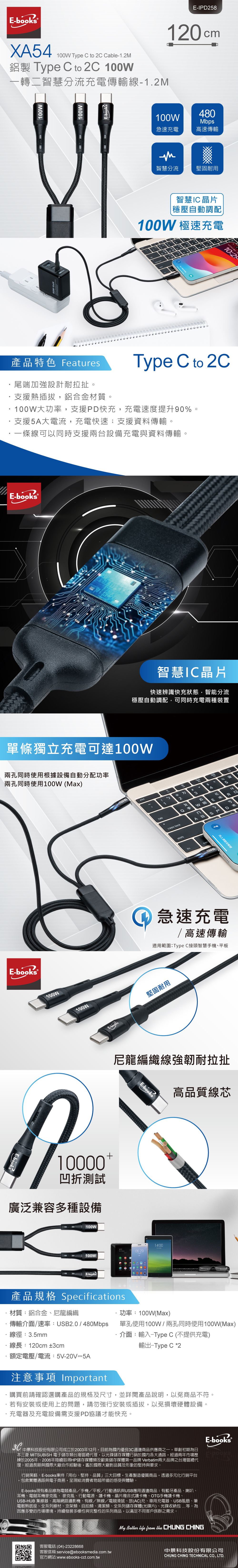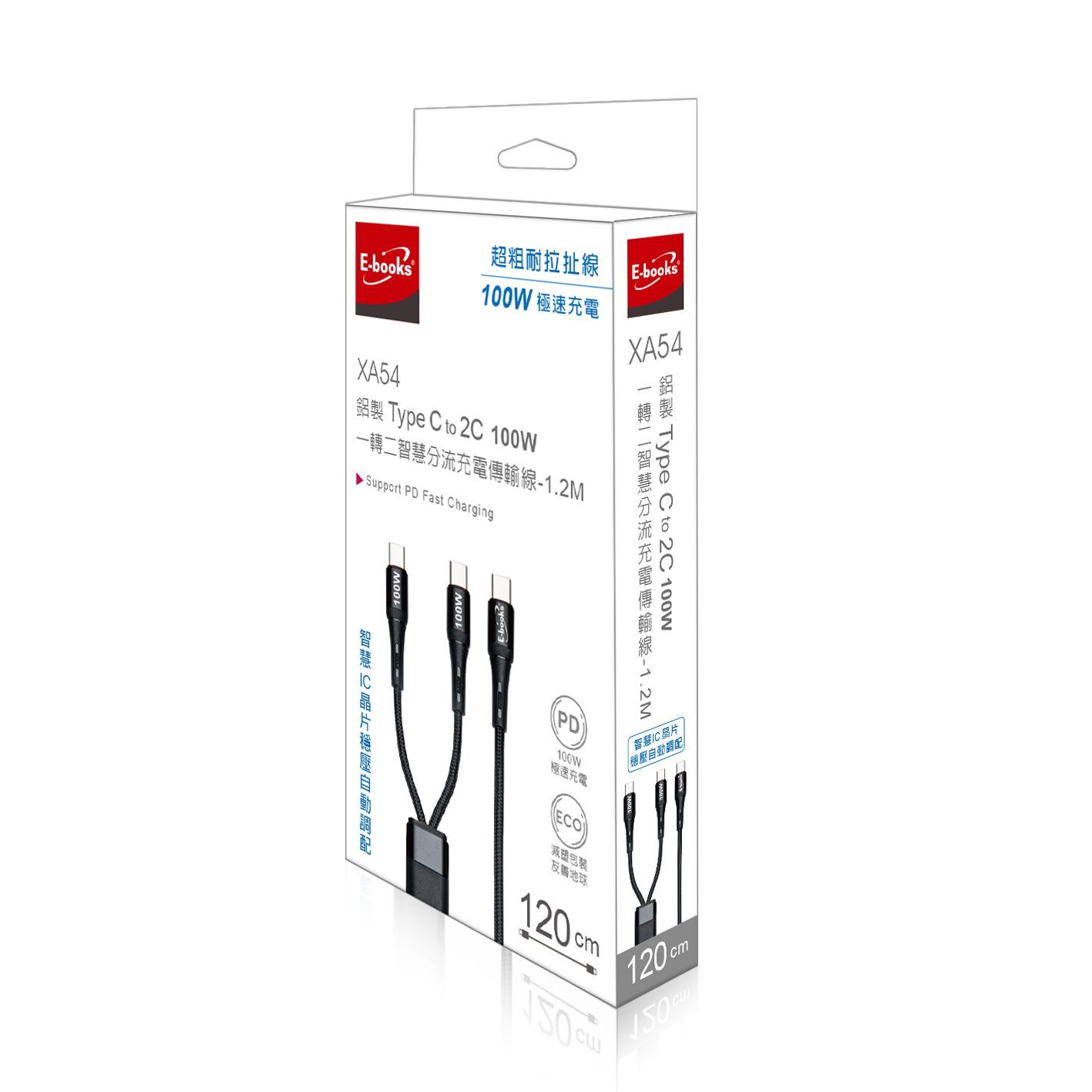 E-books XA54 鋁製Type C to 2C 100W 一轉二智慧分流充電傳輸線-1.2M