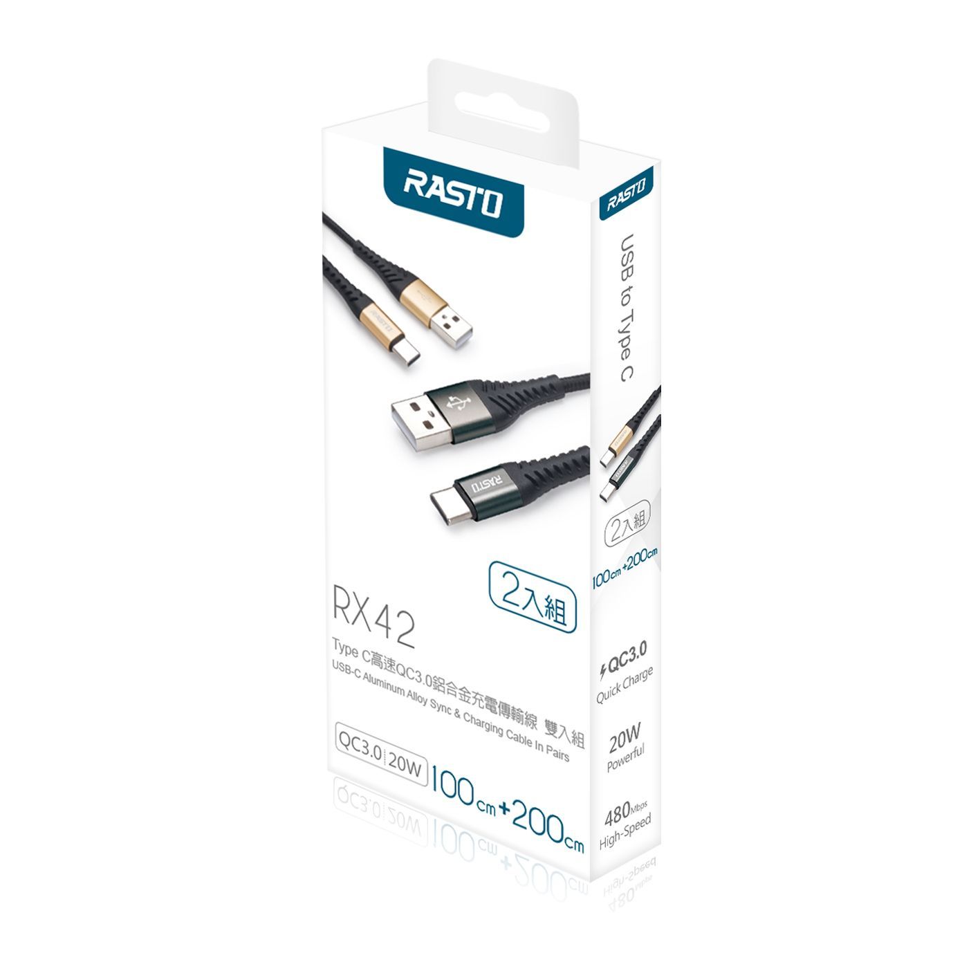 RASTO RX42 Type C 高速QC3.0鋁合金充電傳輸線雙入組1M+2M