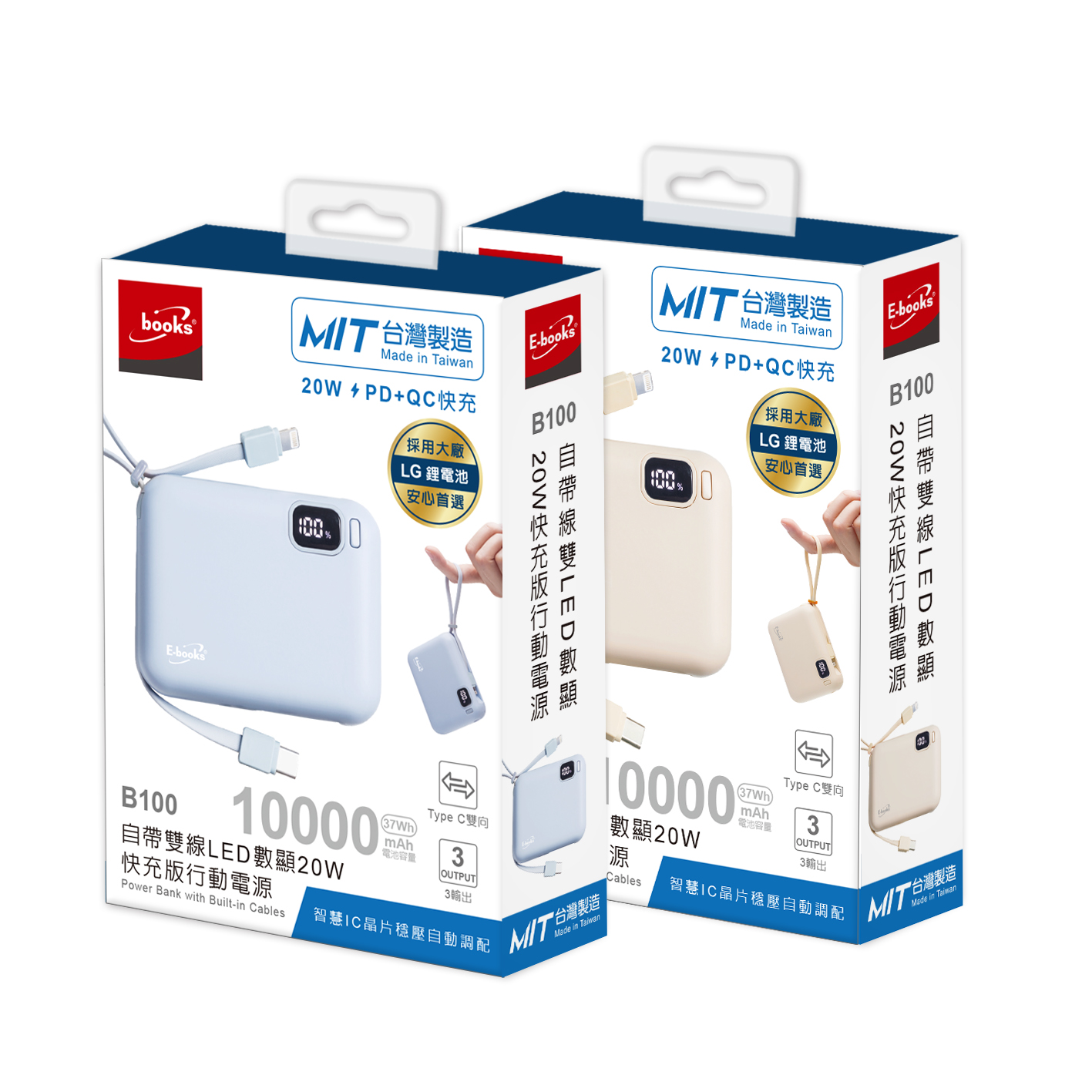 E-Books B100【台灣製造】自帶雙線LED數顯20W快充版行動電源