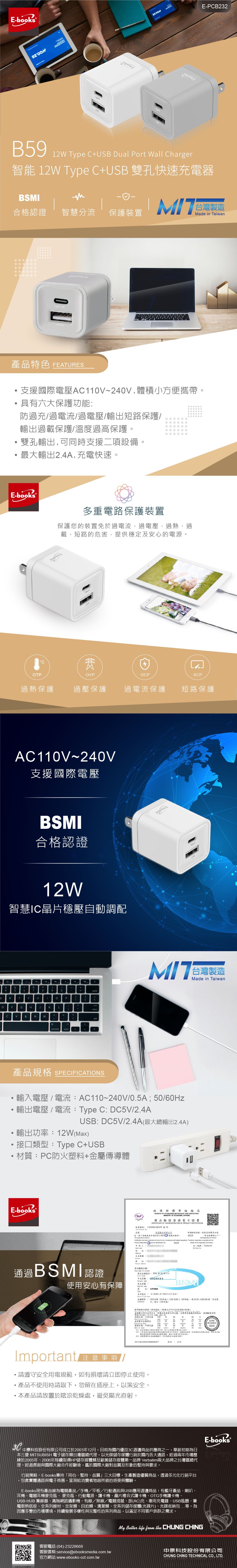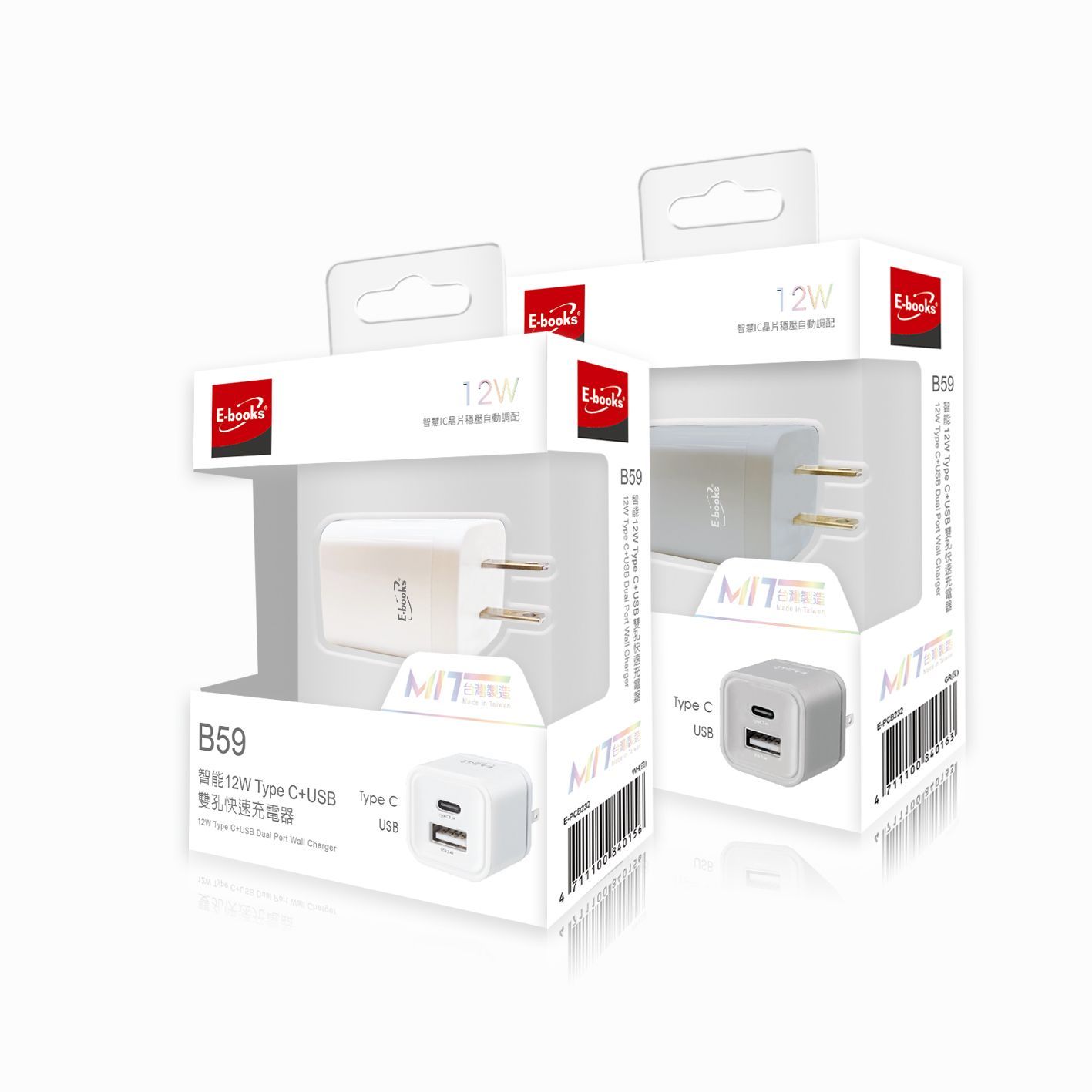 E-books B59 【台灣製造】智能 12W Type C+USB 雙孔快速充電器