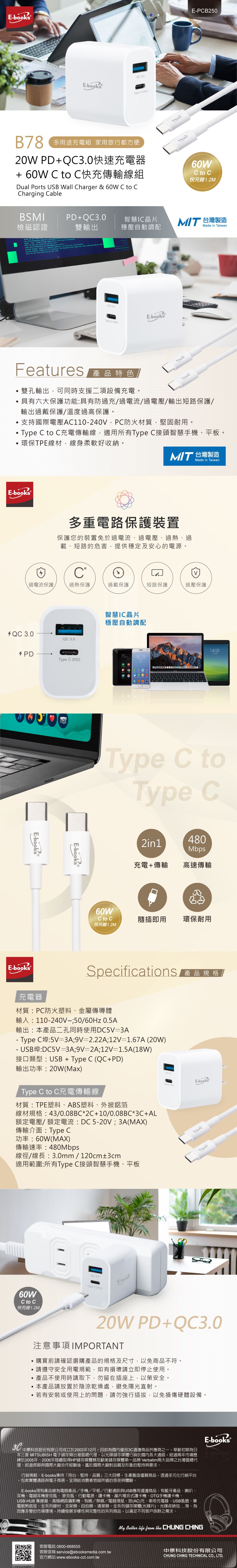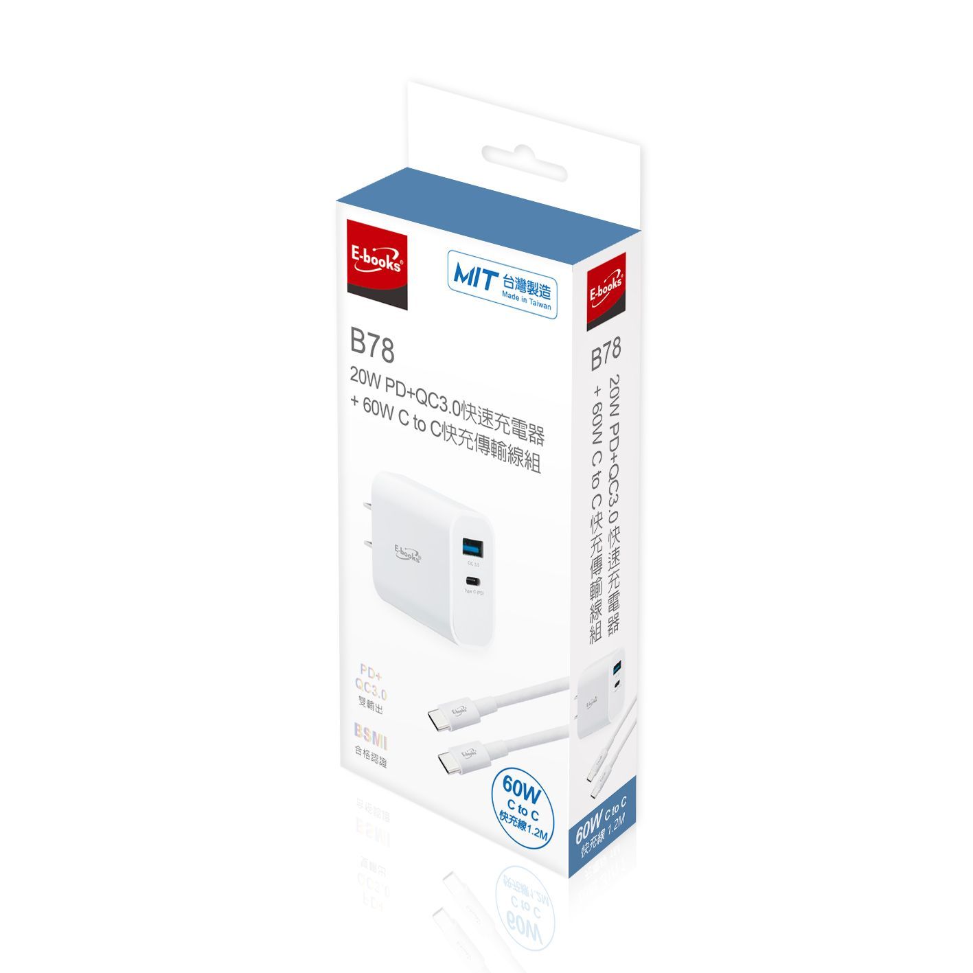 E-books B78 【台灣製造】20W PD+QC3.0快速充電器 + 60W C to C快充傳輸線組