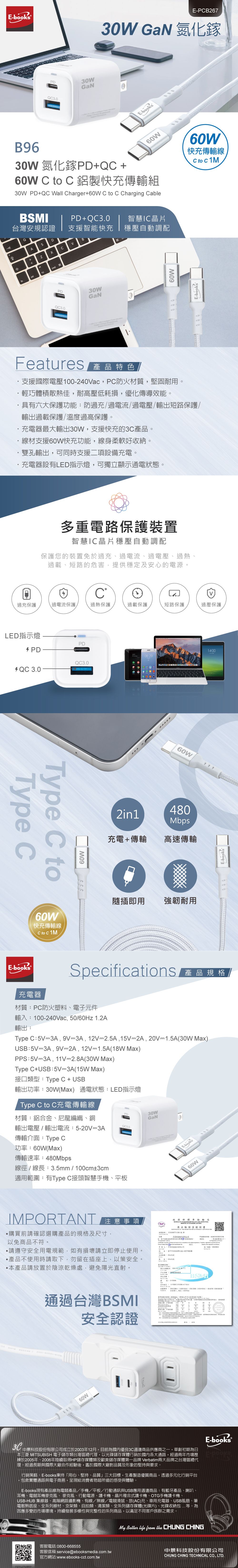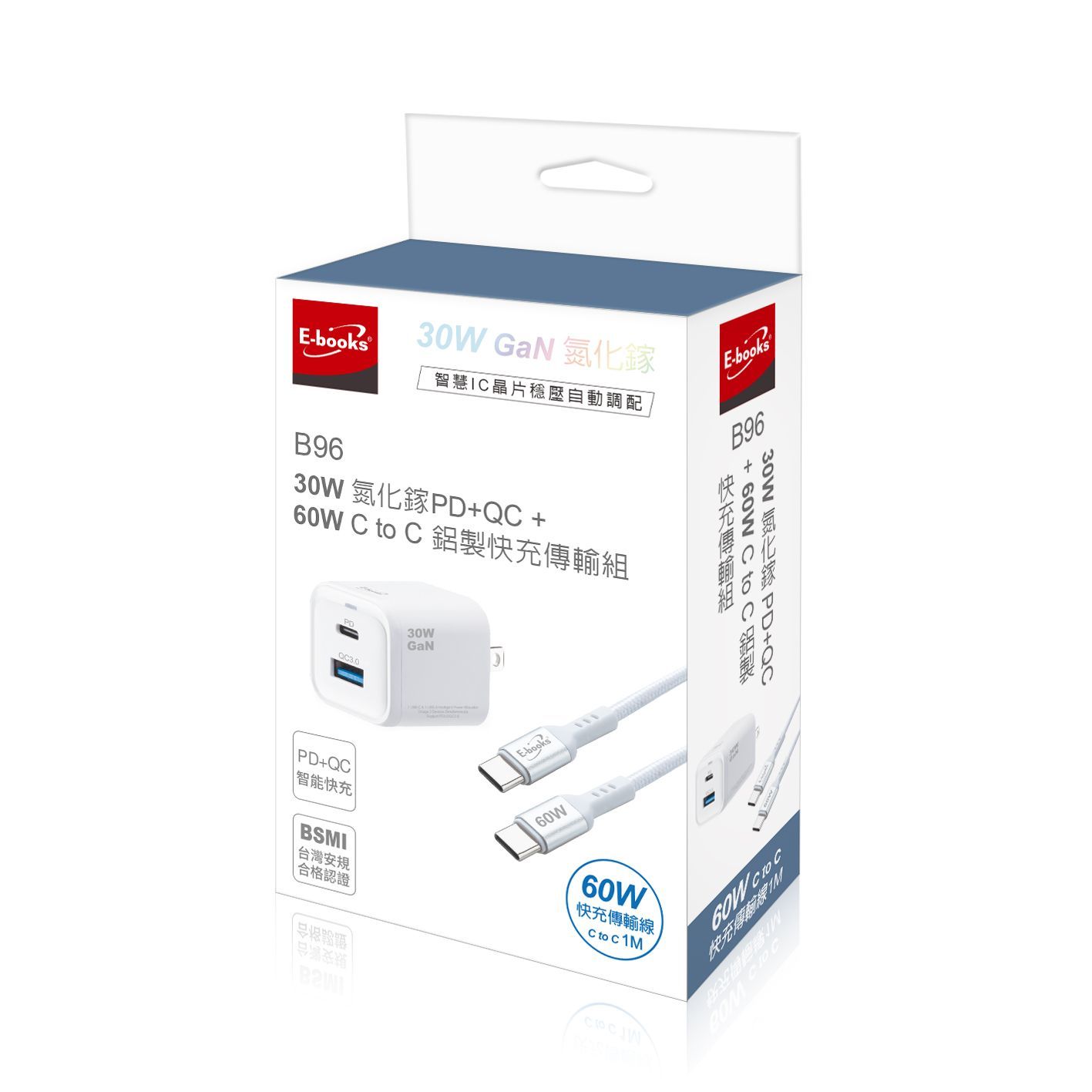 E-books B96 30W 氮化鎵PD+QC + 60W C to C 鋁製快充傳輸線組