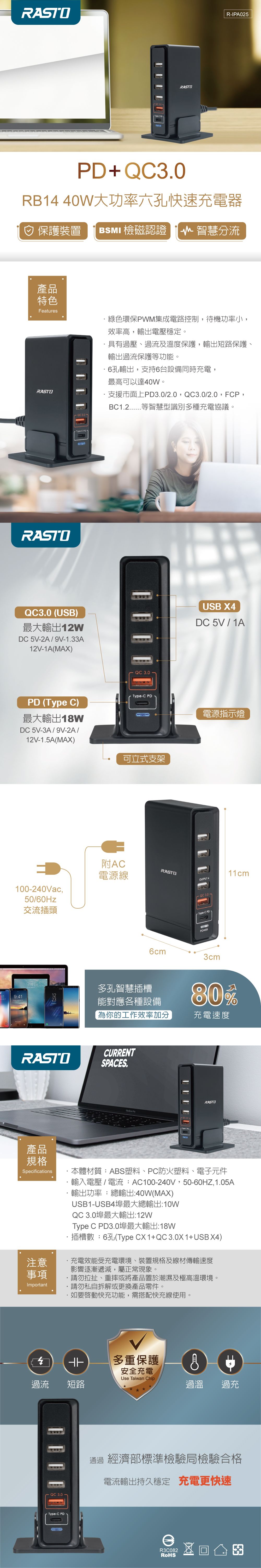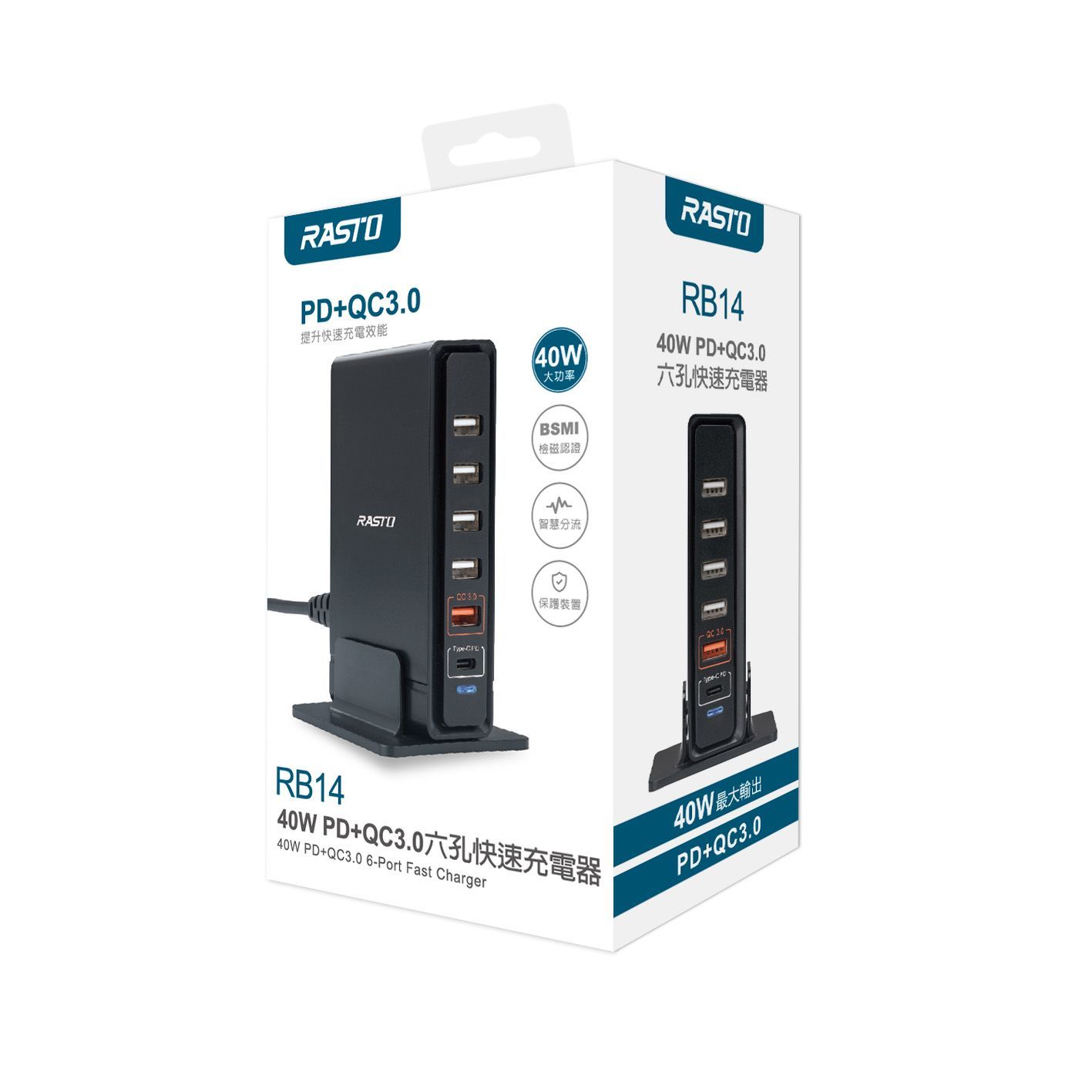 RASTO RB14 40W大功率PD+QC3.0六孔快速充電器