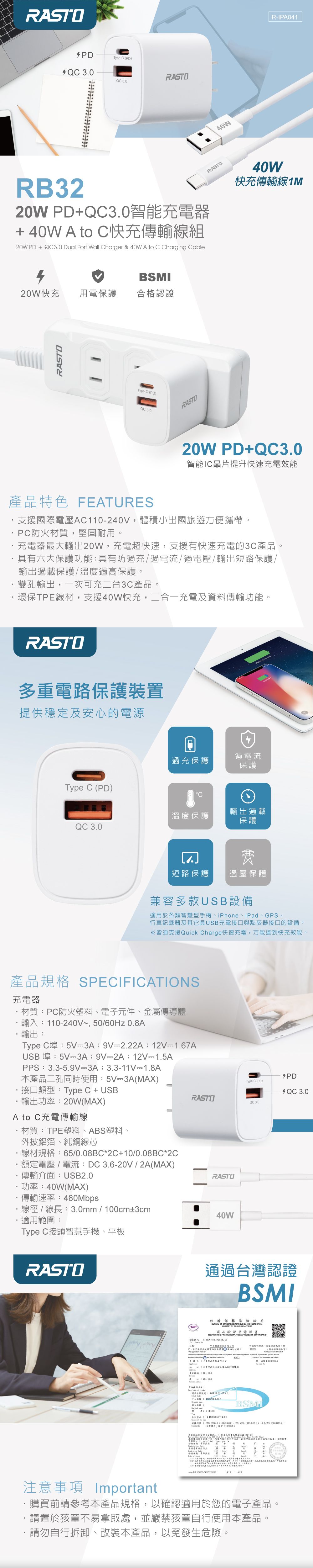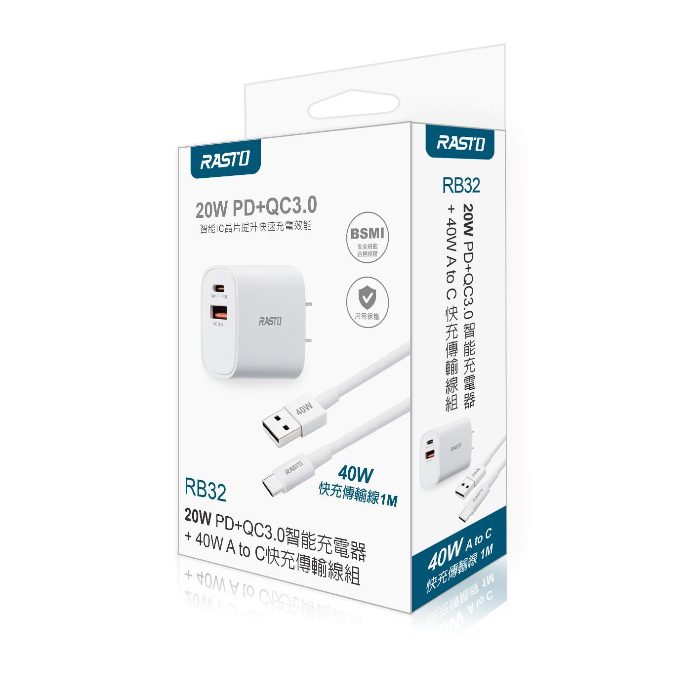 RASTO RB32 20W PD+QC3.0智能充電器 + 40W A to C快充傳輸線組