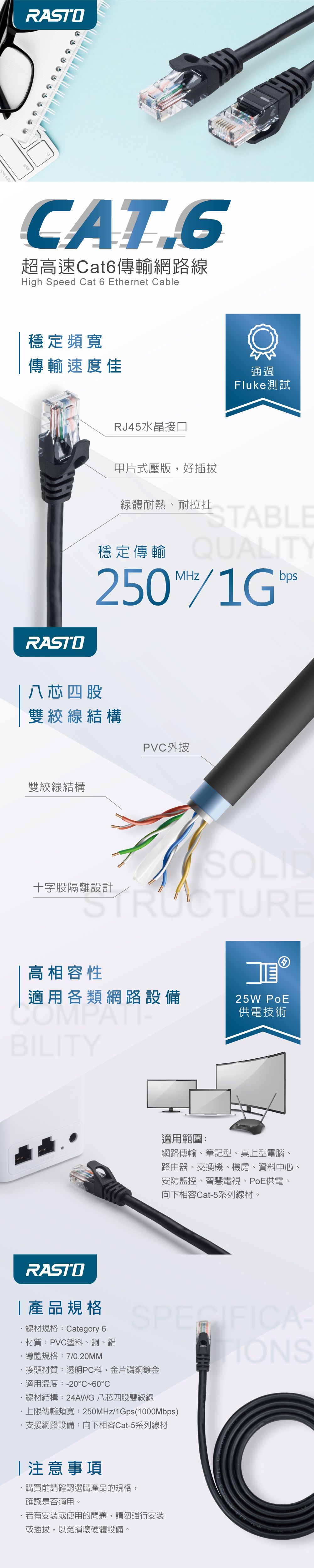 - 符合CAT6國際標準規範 (1000BASE-T 250MHz) 。