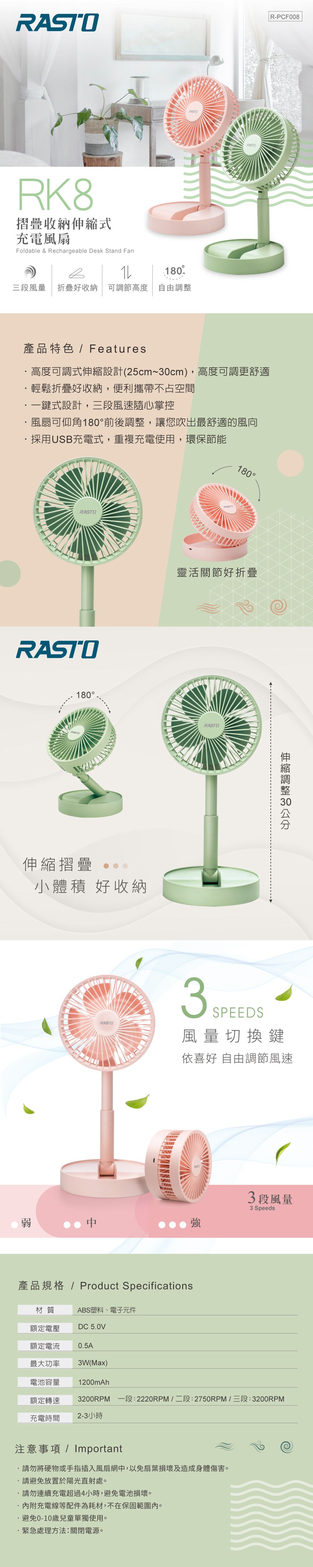 RASTO RK8 摺疊收納伸縮式充電風扇