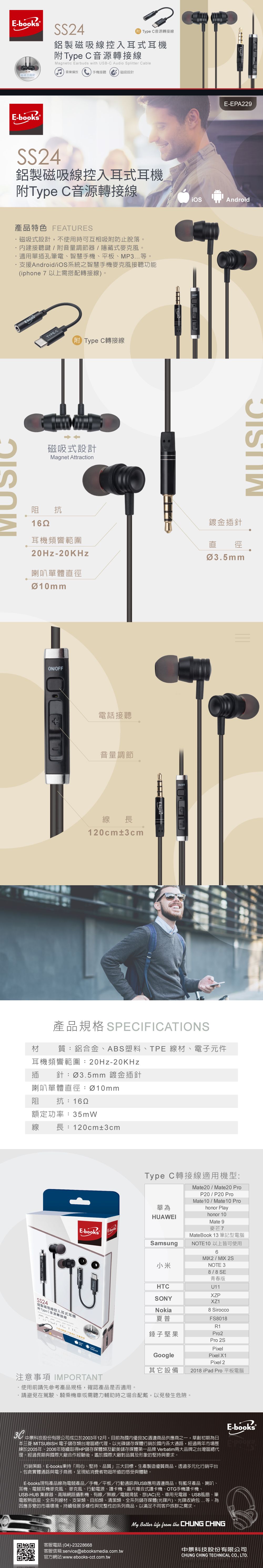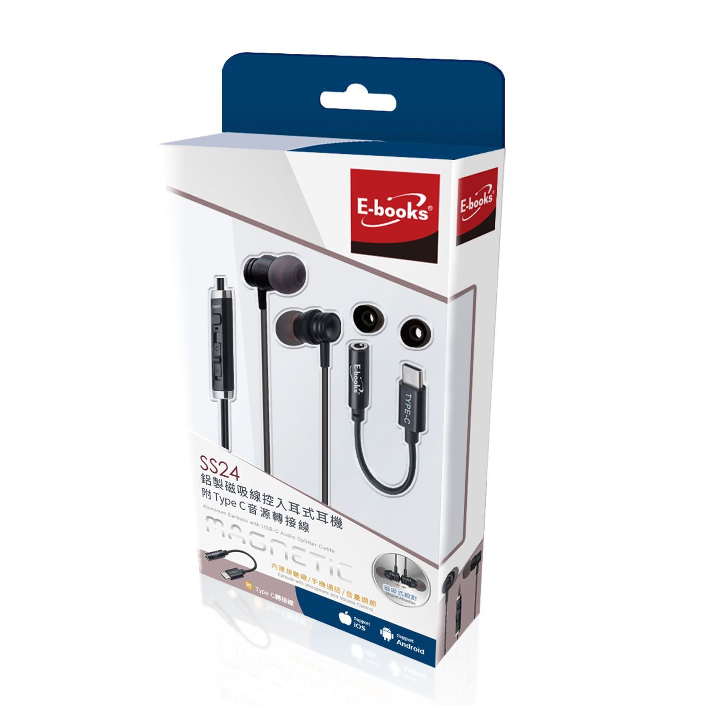 E-books SS24 鋁製磁吸線控入耳式耳機附Type C音源轉接線