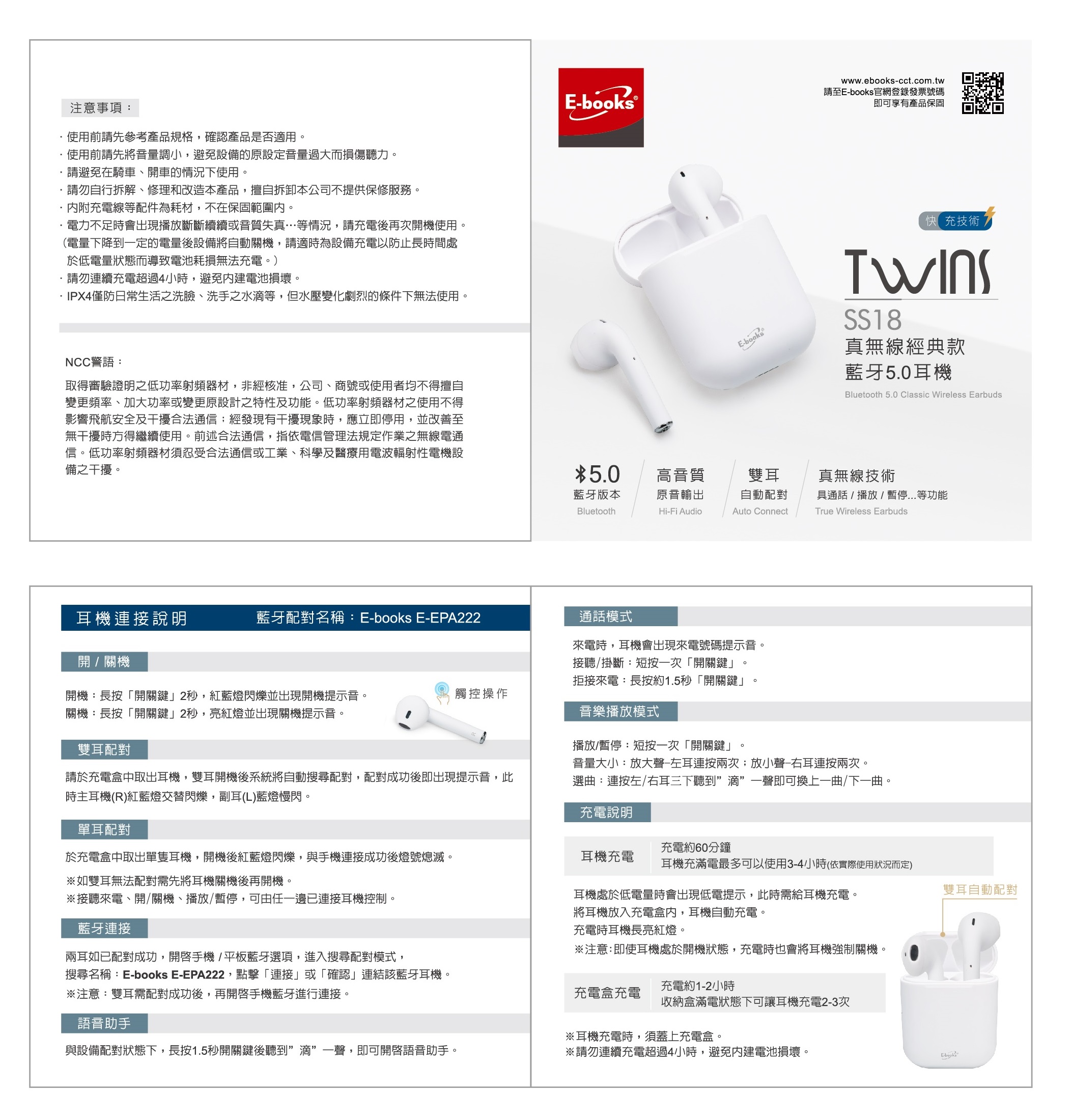 - 雙耳自動配對,開機後自動完成雙邊連線。