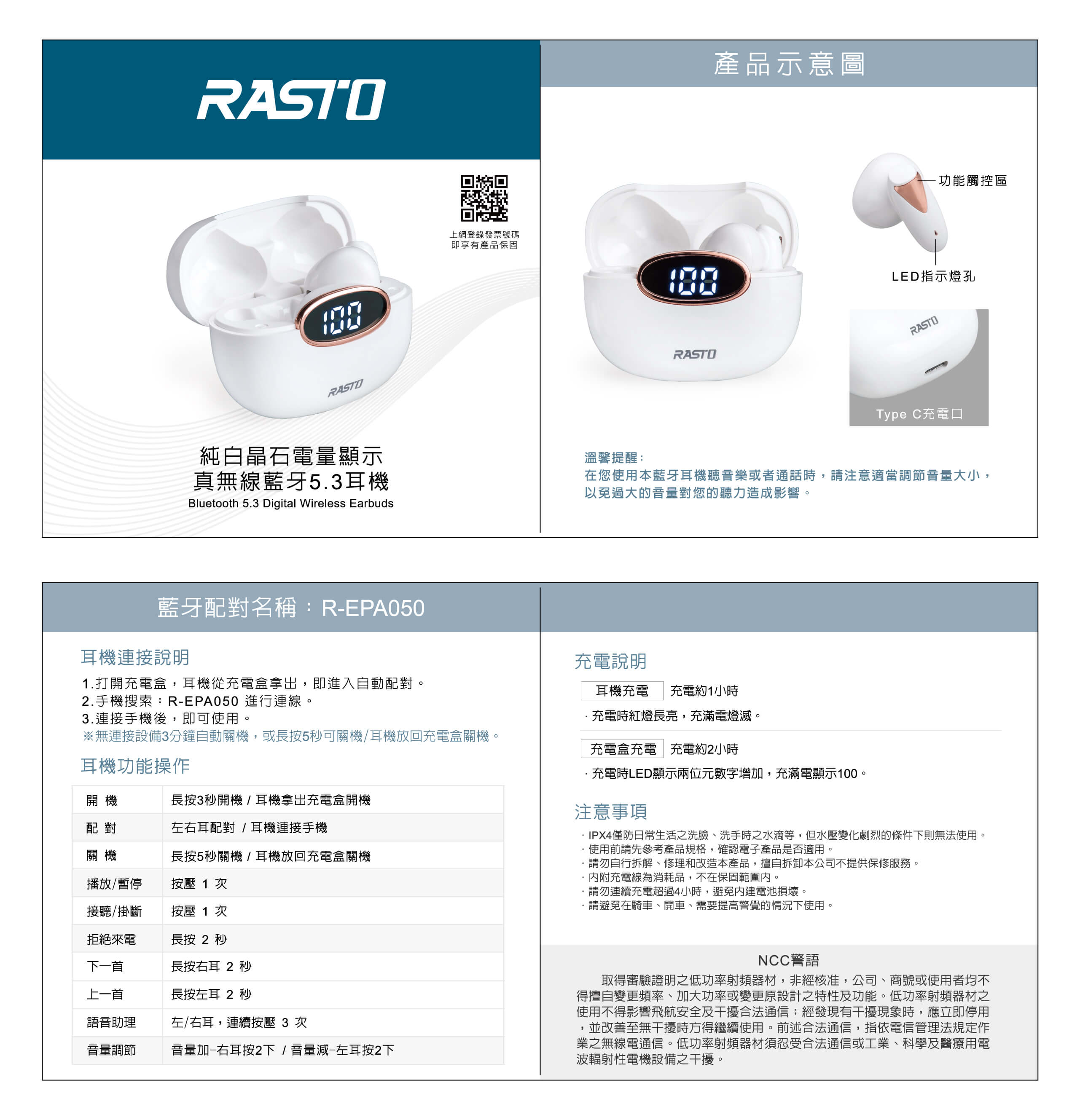 - 充電電壓 / 電流:DC 5V/40mA(耳機 ); DC 5V/300mA(充電盒)