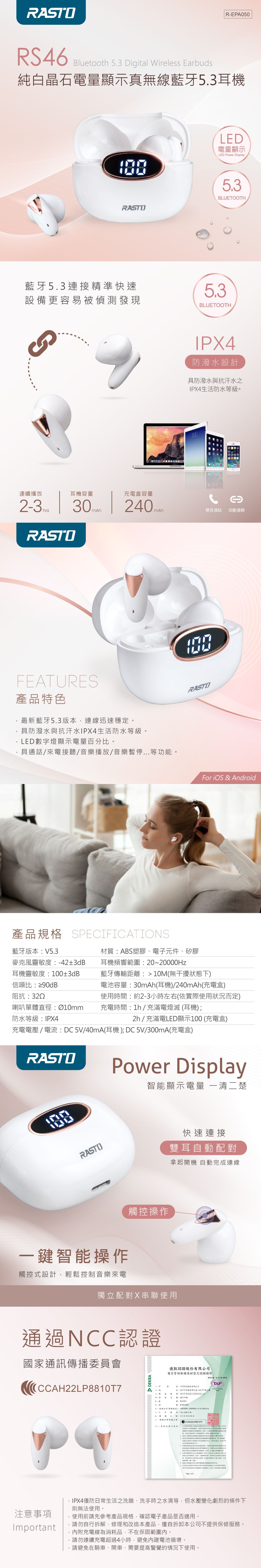 - 電池容量:30mAh (耳機) ; 240mAh(充電盒)