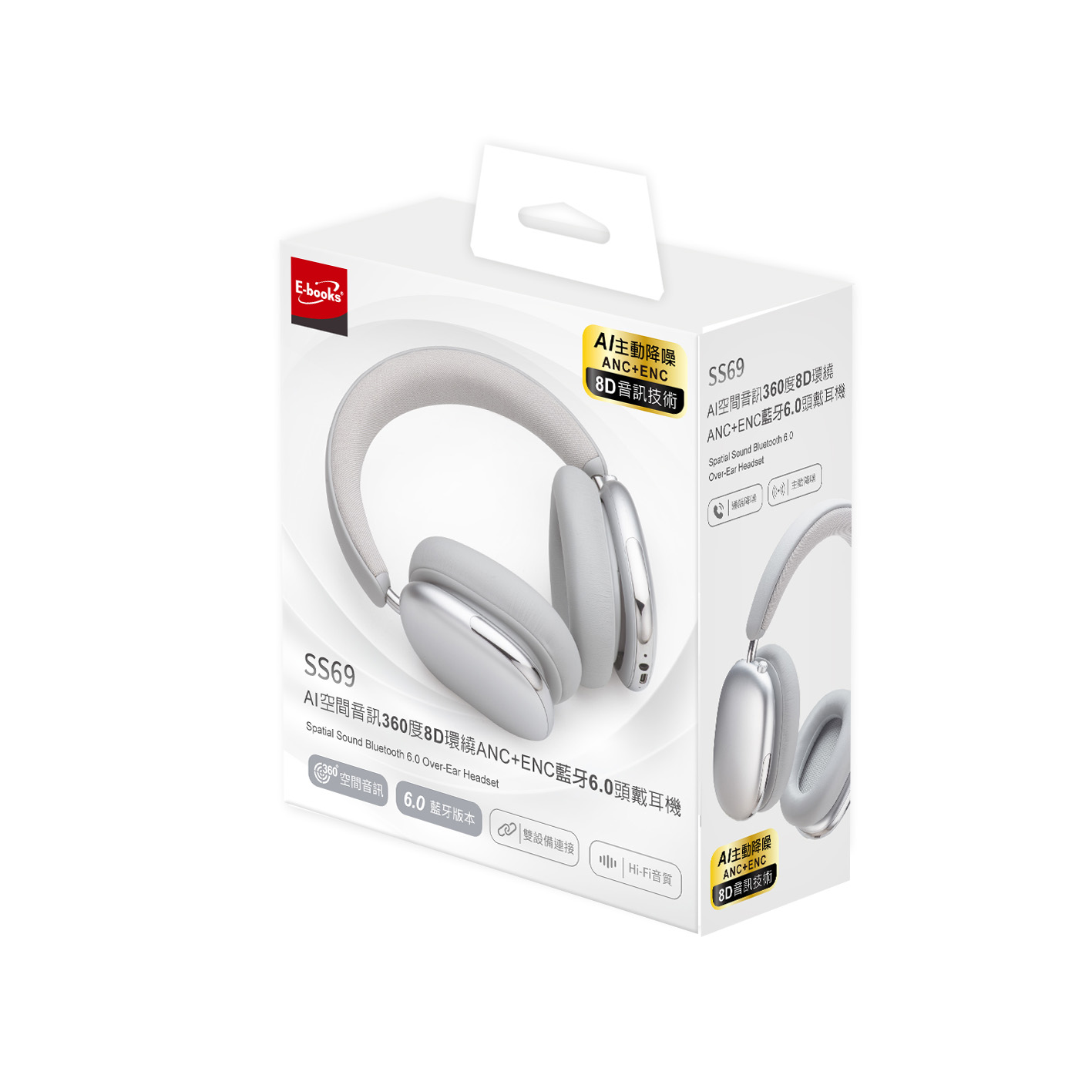 E-books SS69 AI空間音訊360度8D環繞ANC+ENC藍牙6.0頭戴耳機