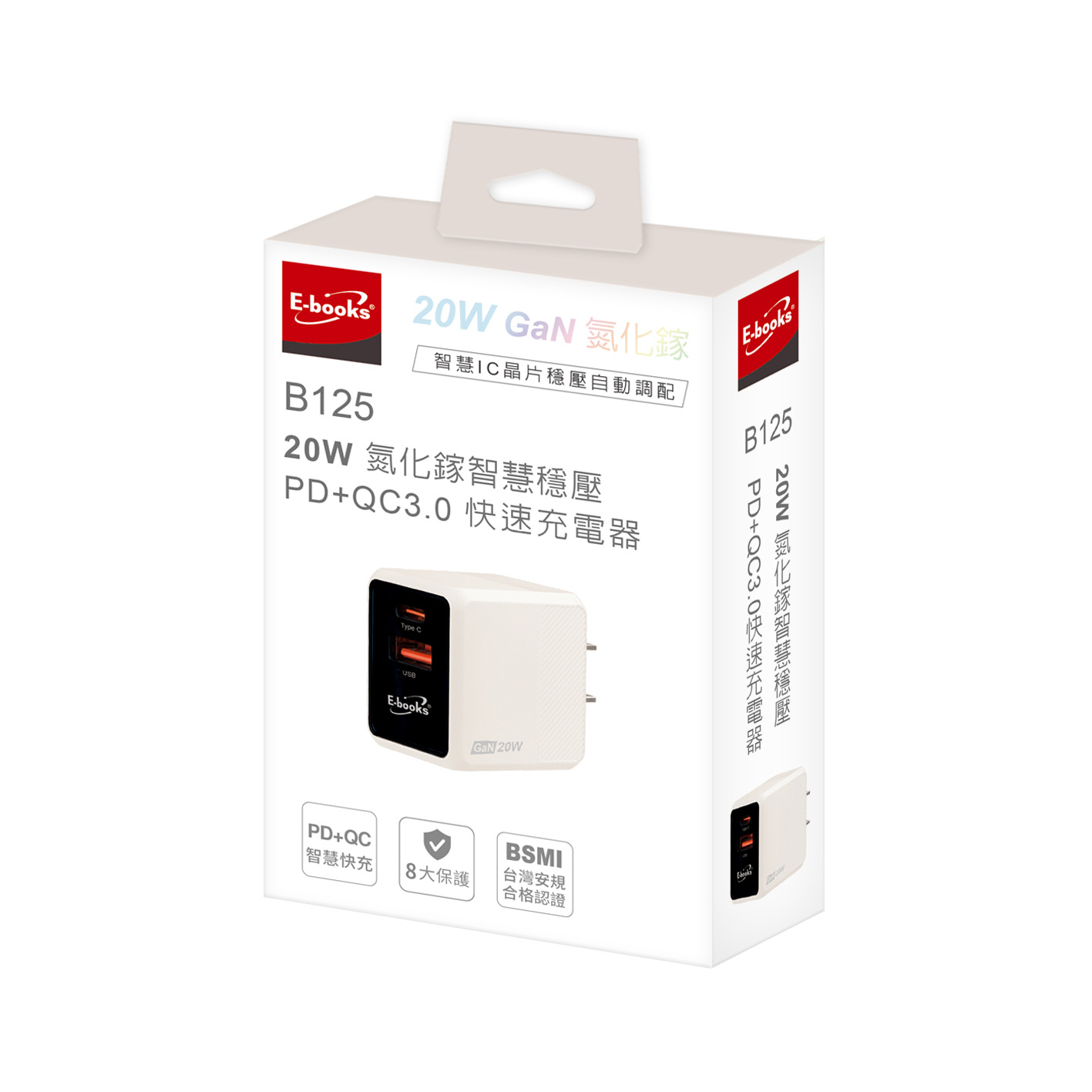 E-books B125 20W 氮化鎵智慧穩壓PD+QC3.0快速充電器