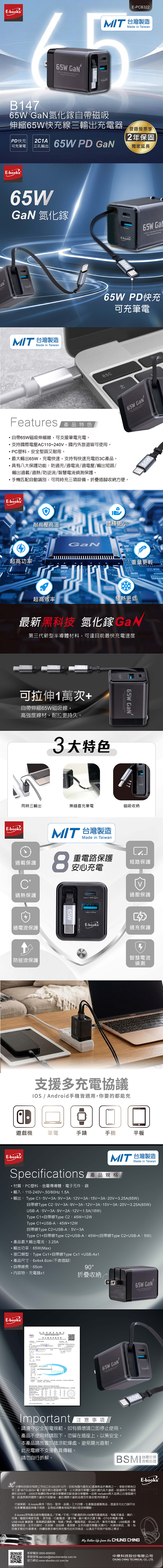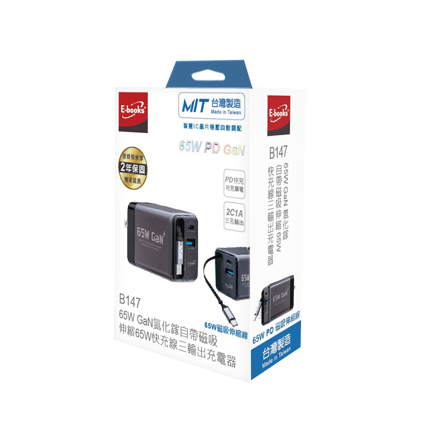 E-books B147【台灣製造】65W GaN氮化鎵自帶磁吸伸縮65W快充線三輸出充電器