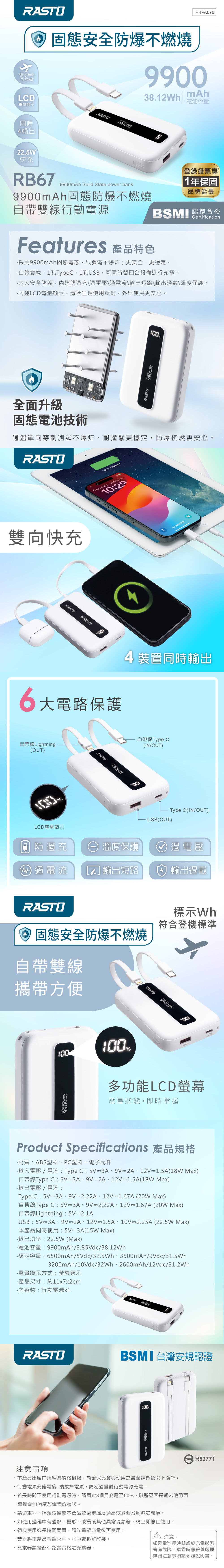 RASTO RB67 9900mAh固態防爆不燃燒自帶雙線行動電源