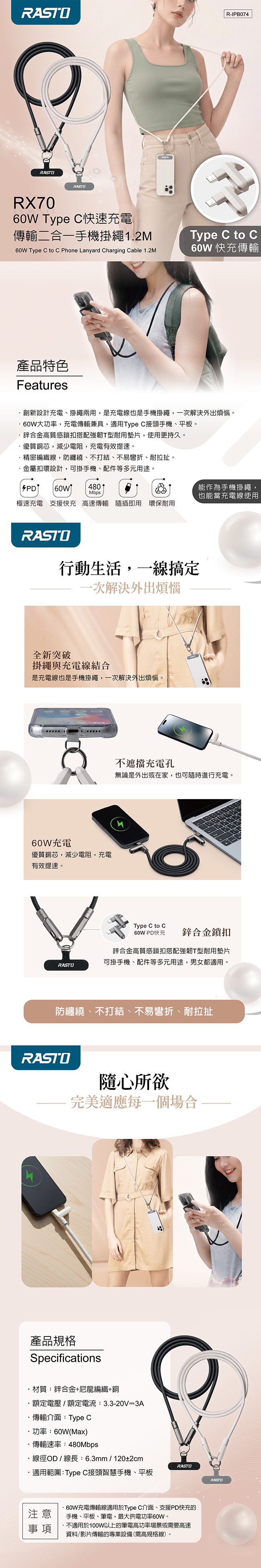 RASTO RX70 60W Type C快速充電傳輸二合一手機掛繩1.2M