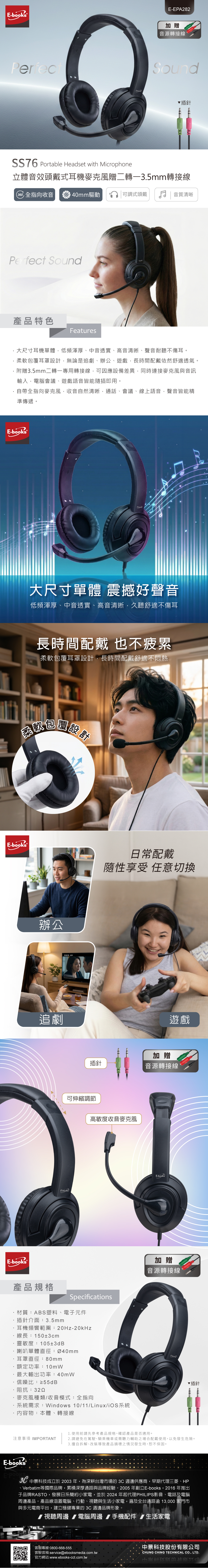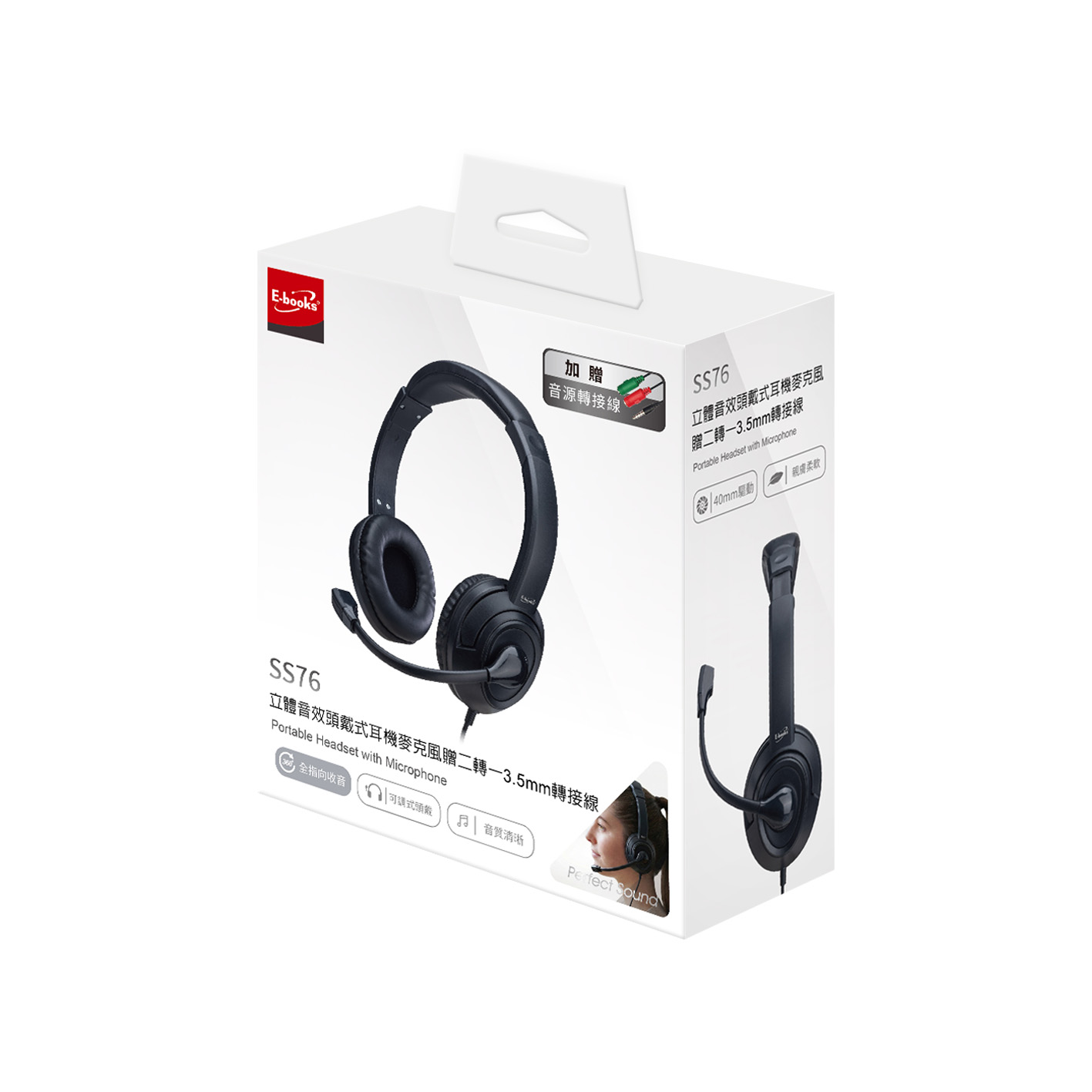 E-books SS76 立體音效頭戴式耳機麥克風贈二轉一3.5mm轉接線