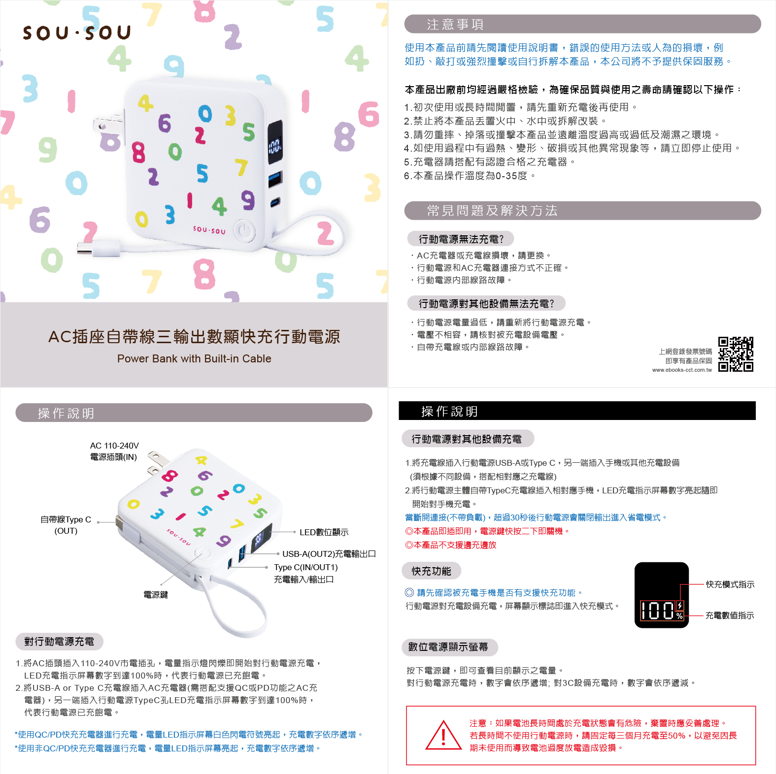 | 01 | SOU.SOU 十數昆【台灣製造】AC插座自帶線三輸出數顯快充行動電源 | 2025/10/01 | |||