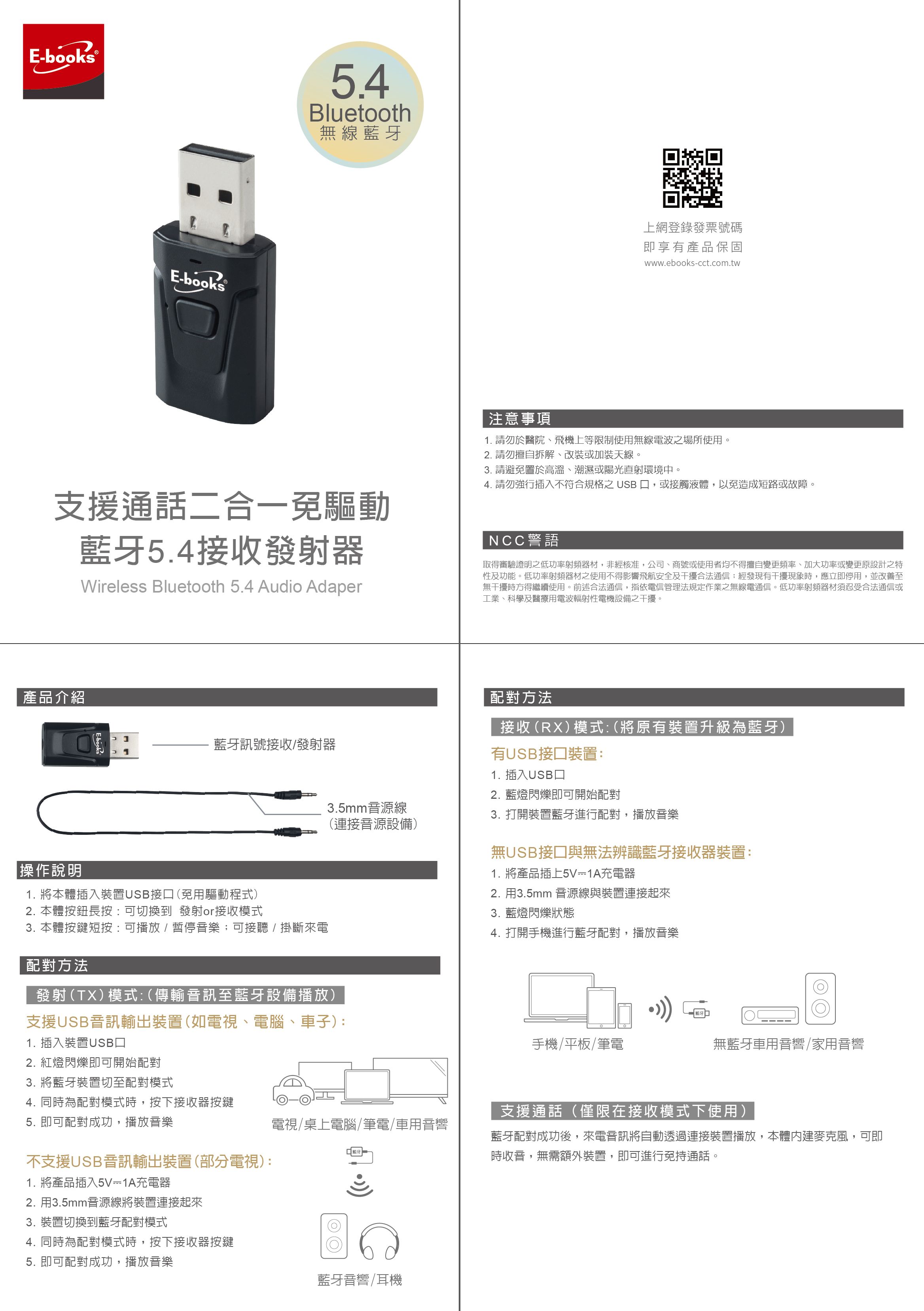 | 01 | E-books Y4 支援通話二合一免驅動藍牙5.4接收發射器 | 2026/04/17 | |||